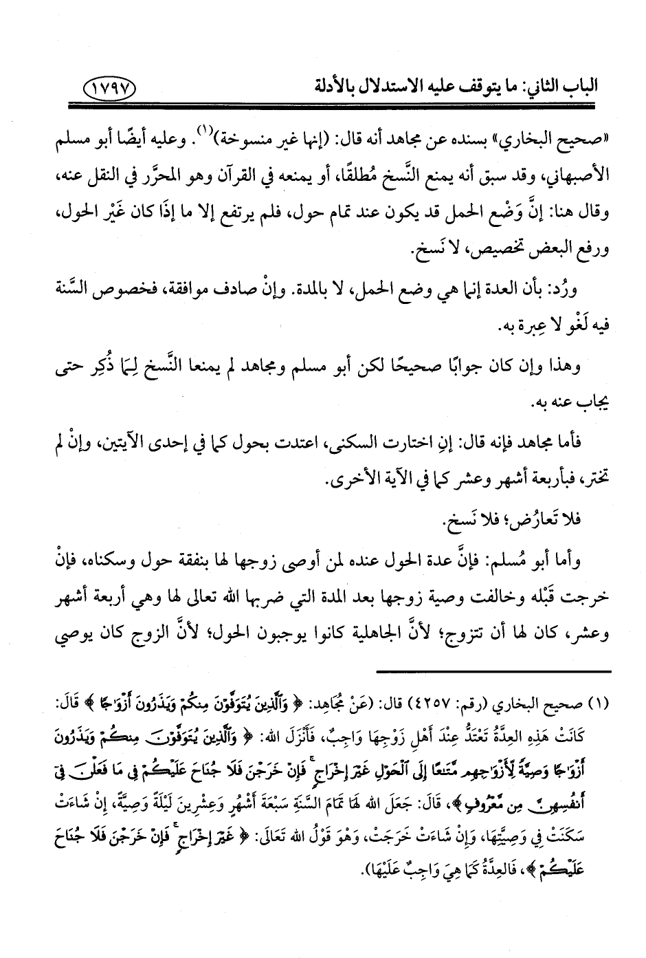 (¬١) صحيح البخاري (رقم: ٤٢٥٧) قال: (عَنْ مُجَاهِد: {وَالَّذِينَ يُتَوَفَّوْنَ مِنْكُمْ وَيَذَرُونَ أَزْوَاجًا} قَالَ: كَانَتْ هَذِهِ العِدَّةُ تَعْتَدُّ عِنْدَ أَهْلِ زَوْجِهَا وَاجِب، فَأنزَلَ الله: {وَالَّذِينَ يُتَوَفَّوْنَ مِنْكُمْ وَيَذَرُونَ أَزْوَاجًا يَتَرَبَّصْنَ بِأَنْفُسِهِنَّ أَرْبَعَةَ أَشْهُرٍ وَعَشْرًا فَإِذَا بَلَغْنَ أَجَلَهُنَّ فَلَا جُنَاحَ عَلَيْكُمْ فِيمَا فَعَلْنَ فِي أَنْفُسِهِنَّ بِالْمَعْرُوفِ}، قَالَ: جَعَلَ الله لها تمامَ السَّنَةِ سَبْعَةَ أَشْهُرٍ وَعِشْرِينَ لَيْلَةً وَصِيَّةً، إِنْ شَاءَتْ سَكَنَتْ فِي وَصِيَّيهَا، وإنْ شَاءَتْ خَرَجَتْ، وَهْوَ قَوْلُ الله تَعَالَى: {غَيْرَ إِخْرَاجٍ فَإِنْ خَرَجْنَ فَلَا جُنَاحَ عَلَيْكُمْ}، فَالعِدةُ كمَا هِيَ وَاجِبٌ عَلَيْهَا).