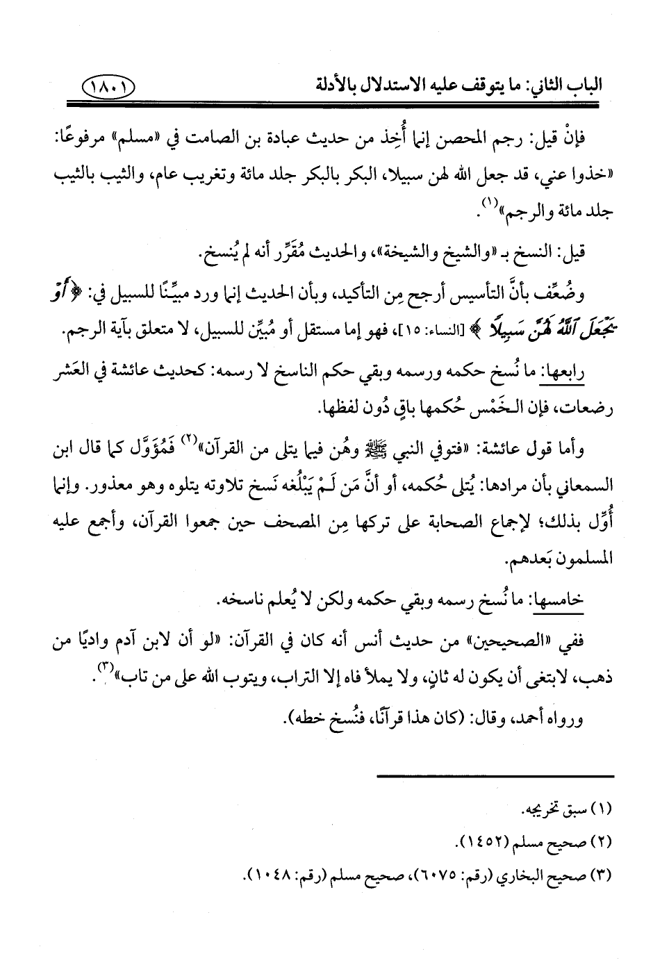 وأما قول عائشة: "فتوفي النبي - صلى الله عليه وسلم - وهُن فيما يتلى من القرآن" (¬٢) فَمُؤَوَّل كما قال ابن السمعاني بأن مرادها: يُتلى حُكمه، أو أنَّ مَن لَمْ يَبْلُغه نَسخ تلاوته يتلوه وهو معذور. وإنما أُوِّل بذلك؛ لإجماع الصحابة على تركها مِن المصحف حين جمعوا القرآن، وأجمع عليه المسلمون بَعدهم.