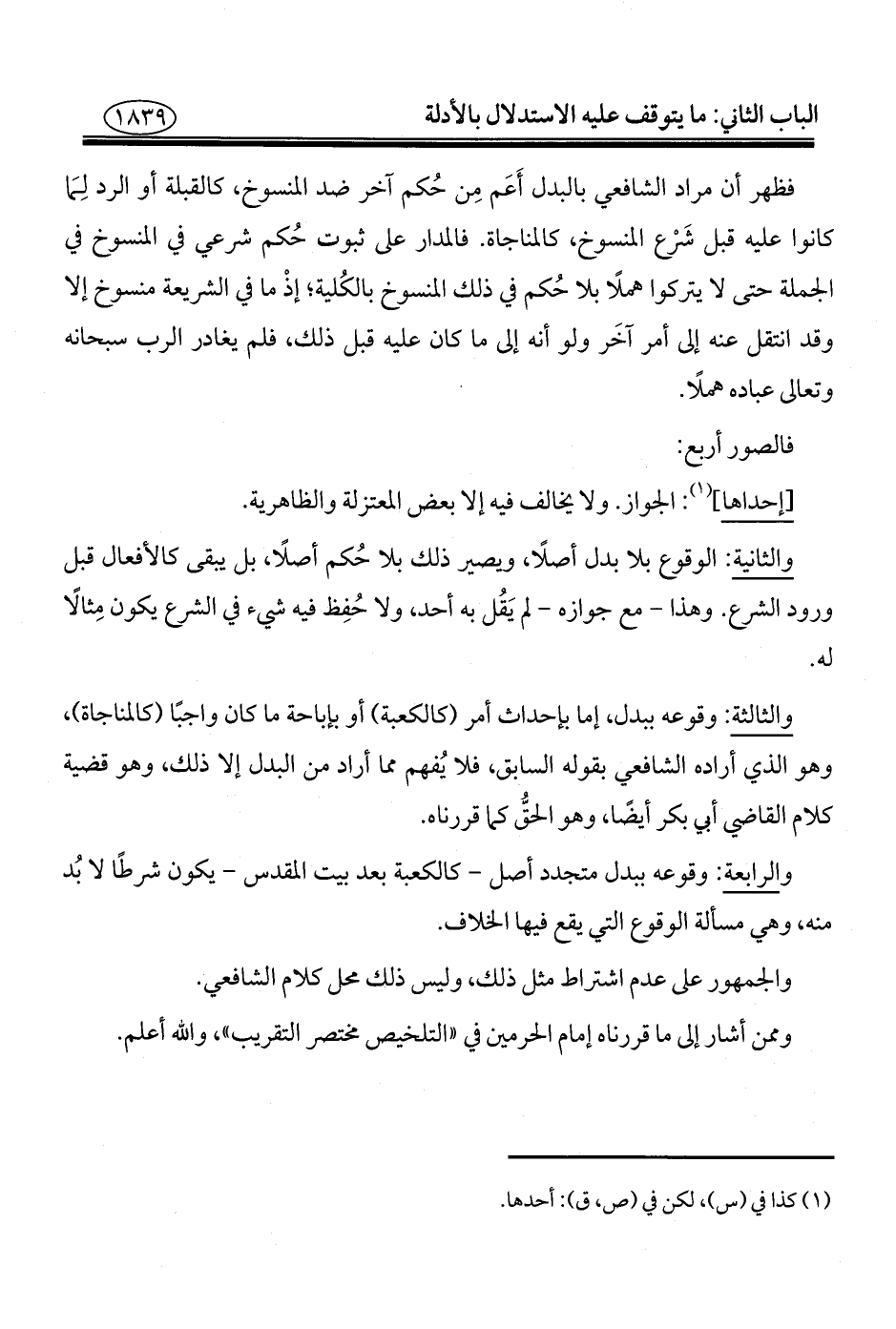 والثالثة: وقوعه ببدل، إما بإحداث أمر (كالكعبة) أو بإباحة ما كان واجبًا (كالمناجاة)، وهو الذي أراده الشافعي بقوله السابق، فلا يُفهم مما أراد من البدل إلا ذلك، وهو قضية كلام القاضي أبي بكر أيضًا، وهو الحقُّ كما قررناه.