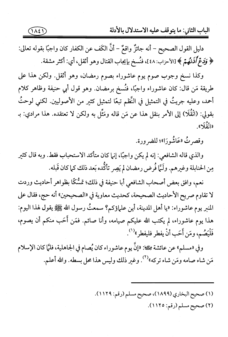 وكذا نسخ وجوب صوم يوم عاشوراء بصوم رمضان، وهو أثقل. ولكن هذا علي طريقة مَن قال: كان عاشوراء واجبًا، فنُسخ برمضان. وهو قول أبي حنيفة وظاهر كلام أحمد، وعليه جريتُ في التمثيل في النَّظم تبعًا لتمثيل كثير من الأصوليين. لكني لوحتُ بقولي: (انْقُلَا) إلي الأمر بنقل هذا عن مَن قاله ومَثِّل به ولكن لا تعتقده. هذا مرادي: بـ "انْقُلَا".