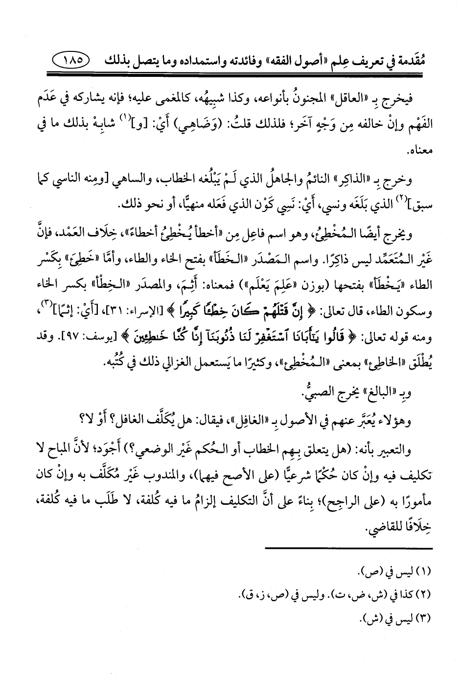 ويخرج أيضًا المُخْطِئُ، وهو اسم فاعِل مِن "أخطأ يُخْطِئُ أخطاءً"، خِلَاف العَمْد، فإنَّ غَيْر المُتَعَمِّد ليس ذاكِرًا. واسم المَصْدَر "الخَطَأ" بفتح الخاء والطاء، وأمَّا "خَطِئَ" بِكَسْر الطاء "يَخْطَأ" بفتحها (يوزن "عَلِمَ يَعْلَم") فمعناه: أَثِمَ، والمصدَر "الخِطْأ" بكسر الخاء وسكون الطاء، قال تعالى: {إِنَّ قَتْلَهُمْ كَانَ خِطْئًا كَبِيرًا} [الإسراء: ٣١]، [أَيْ: إثمًا] (¬٣)، ومنه قوله تعالى: {قَالُوا يَاأَبَانَا اسْتَغْفِرْ لَنَا ذُنُوبَنَا إِنَّا كُنَّا خَاطِئِينَ} [يوسف: ٩٧]. وقد يُطْلَق "الخاطِئ" بمعنى "المُخْطِئ"، وكثيرًا ما يَستعمل الغزالي ذلك في كُتُبه.