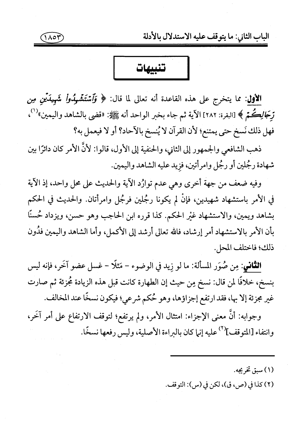 الأول: مما يتخرج على هذه القاعدة أنه تعالى لما قال: {وَاسْتَشْهِدُوا شَهِيدَيْنِ مِنْ رِجَالِكُمْ} [البقرة: ٢٨٢] الآية ثم جاء بخبر الواحد أنه - صلى الله عليه وسلم -: "قضي بالشاهد واليمين" (¬١)، فهل ذلك نَسخ حتي يمتنع؛ لأن القرآن لا يُنسخ بالآحاد؟ أو لا فيعمل به؟