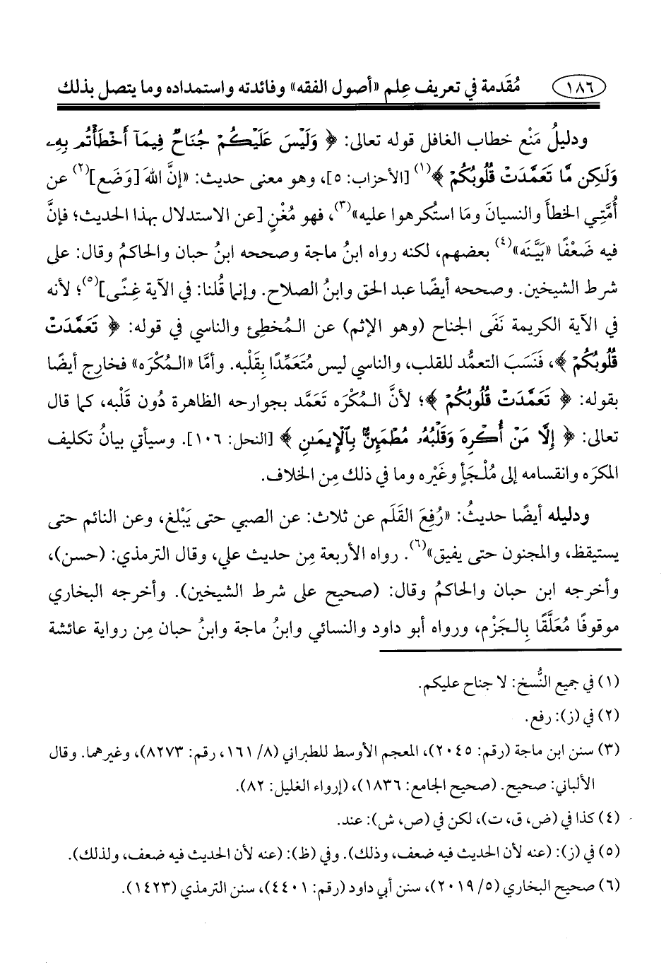 ودليلُ مَنْع خطاب الغافل قوله تعالى: {وَلَيْسَ عَلَيْكُمْ جُنَاحٌ فِيمَا أَخْطَأْتُمْ بِهِ وَلَكِنْ مَا تَعَمَّدَتْ قُلُوبُكُمْ} (¬١) [الأحزاب: ٥]، وهو معنى حديث: "إنَّ اللهَ [وَضَع] (¬٢) عن أُمَّتِي الخطأَ والنسيانَ ومَا استُكرهوا عليه" (¬٣)، فهو مُغْنٍ [عن الاستدلال بهذا الحديث؛ فإنَّ فيه ضعْفًا "بَيَّنَه" (¬٤) بعضهم، لكنه رواه ابنُ ماجه وصححه ابنُ حبان والحاكمُ وقال: على شرط الشيخين. وصححه أيضًا عبد الحق وابنُ الصلاح. وإنما قُلنا: في الآية غِنًى] (¬٥)؛ لأنه في الآية الكريمة نَفَى الجناح (وهو الإثم) عن المُخطِئ والناسي في قوله: {تَعَمَّدَتْ قُلُوبُكُمْ}، فَنَسَبَ التعمُّد للقلب، والناسي ليس مُتَعَمِّدًا بِقَلْبه. وأمَّا "المُكْرَه" فخارِج أيضًا بقوله: {تَعَمَّدَتْ قُلُوبُكُمْ}؛ لأنَّ المُكْرَه تَعَمَّد بجوارحه الظاهرة دُون قَلْبه، كما قال تعالى: {إِلَّا مَنْ أُكْرِهَ وَقَلْبُهُ مُطْمَئِنٌّ بِالْإِيمَانِ} [النحل: ١٠٦]. وسيأتي بيانُ تكليف المكرَه وانقسامه إلى مُلْجَأٍ وغَيْره وما في ذلك مِن الخلاف.