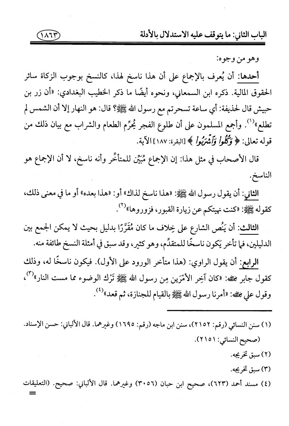 أحدها: أن يُعرف بالإجماع على أن هذا ناسخ لهذا، كالنسخ بوجوب الزكاة سائر الحقوق المالية. ذكره ابن السمعاني، ونحوه أيضًا ما ذكر الخطيب البغدادي: "أن زر بن حبيش قال لحذيفة: أي ساعة تسحرتم مع رسول الله - صلى الله عليه وسلم -؟ قال: هو النهار إلا أن الشمس لم تطلع" (¬١). وأجمع المسلمون على أن طلوع الفجر يُحرِّم الطعام والشراب مع بيان ذلك من قوله تعالى: {وَكُلُوا وَاشْرَبُوا} [البقرة: ١٨٧] الآية.