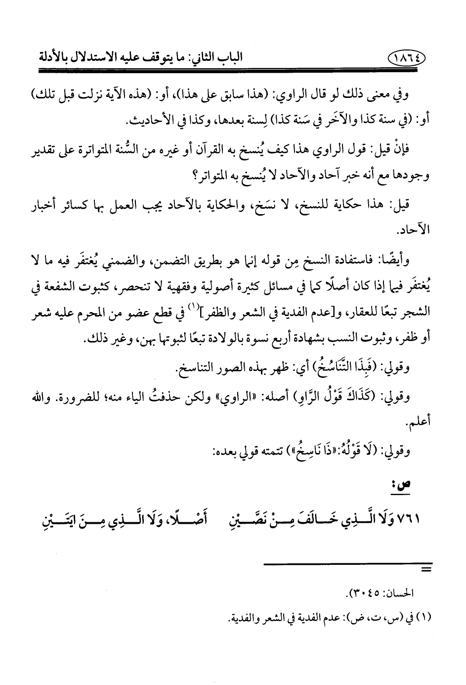 وأيضًا: فاستفادة النسخ مِن قوله إنما هو بطريق التضمن، والضمني يُغتفَر فيه ما لا يُغتفَر فيما إذا كان أصلًا كما في مسائل كثيرة أصولية وفقهية لا تنحصر، كثبوت الشفعة في الشجر تبعًا للعقار، و [عدم الفدية في الشعر والظفر] (¬١) في قطع عضو من المحرم عليه شعر أو ظفر، وثبوت النسب بشهادة أربع نسوة بالولادة تبعًا لثبوتها بهن، وغير ذلك.