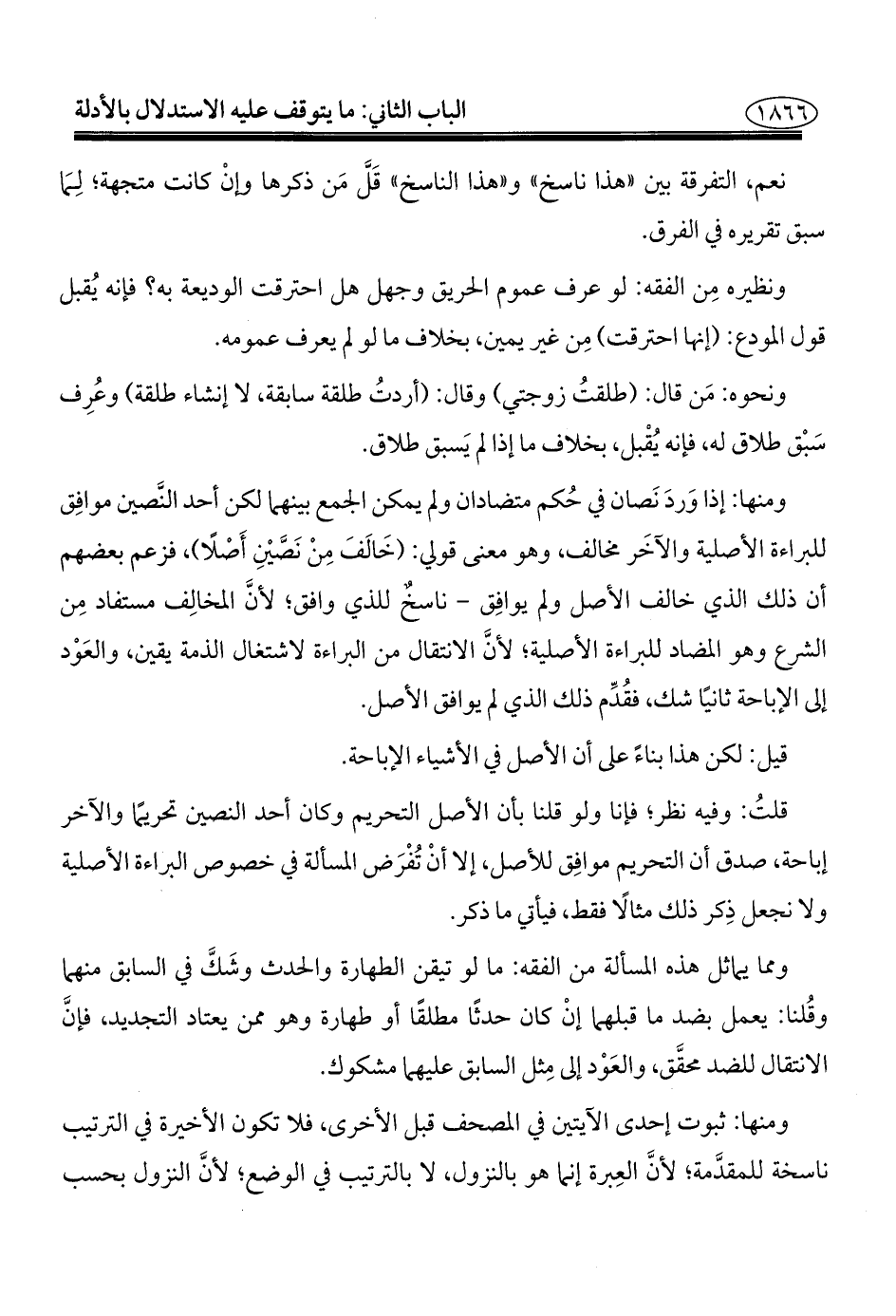 ومنها: إذا وَردَ نَصان في حُكم متضادان ولم يمكن الجمع بينهما لكن أحد النَّصين موافِق للبراءة الأصلية والآخَر مخالف، وهو معنى قولي: (خَالَفَ مِنْ نَصَّيْنِ أَصْلًا)، فزعم بعضهم أن ذلك الذي خالف الأصل ولم يوافِق -ناسخٌ للذي وافق؛ لأنَّ المخالِف مستفاد مِن الشرع وهو المضاد للبراءة الأصلية؛ لأنَّ الانتقال من البراءة لاشتغال الذمة يقين، والعَوْد إلى الإباحة ثانيًا شك، فقُدِّم ذلك الذي لم يوافق الأصل.