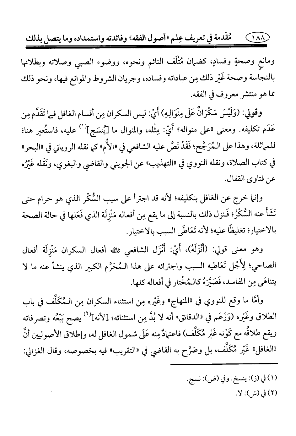 وقولي: (وَلَيْسَ سَكْرَانٌ عَلَى مِنْوَالِهِ) أَيْ: ليس السكران مِن أقسام الغافل فيما تَقَدَّم مِن عَدَم تكليفه. ومعنى "على منواله" أَيْ: مِثْله، والمنوال ما [يُنسَج] (¬١) عليه، فاستُعير هنا؛ للمماثلة، وهذا على المُرَجَّح؛ فَقَدْ نَصَّ عليه الشافعي في "الأُم" كما نقله الروياني في "البحر" في كتاب الصلاة، ونقله النووي في "التهذيب" عن الجويني والقاضي والبغوي، ونَقَله غَيْرُه عن فتاوى القفال.