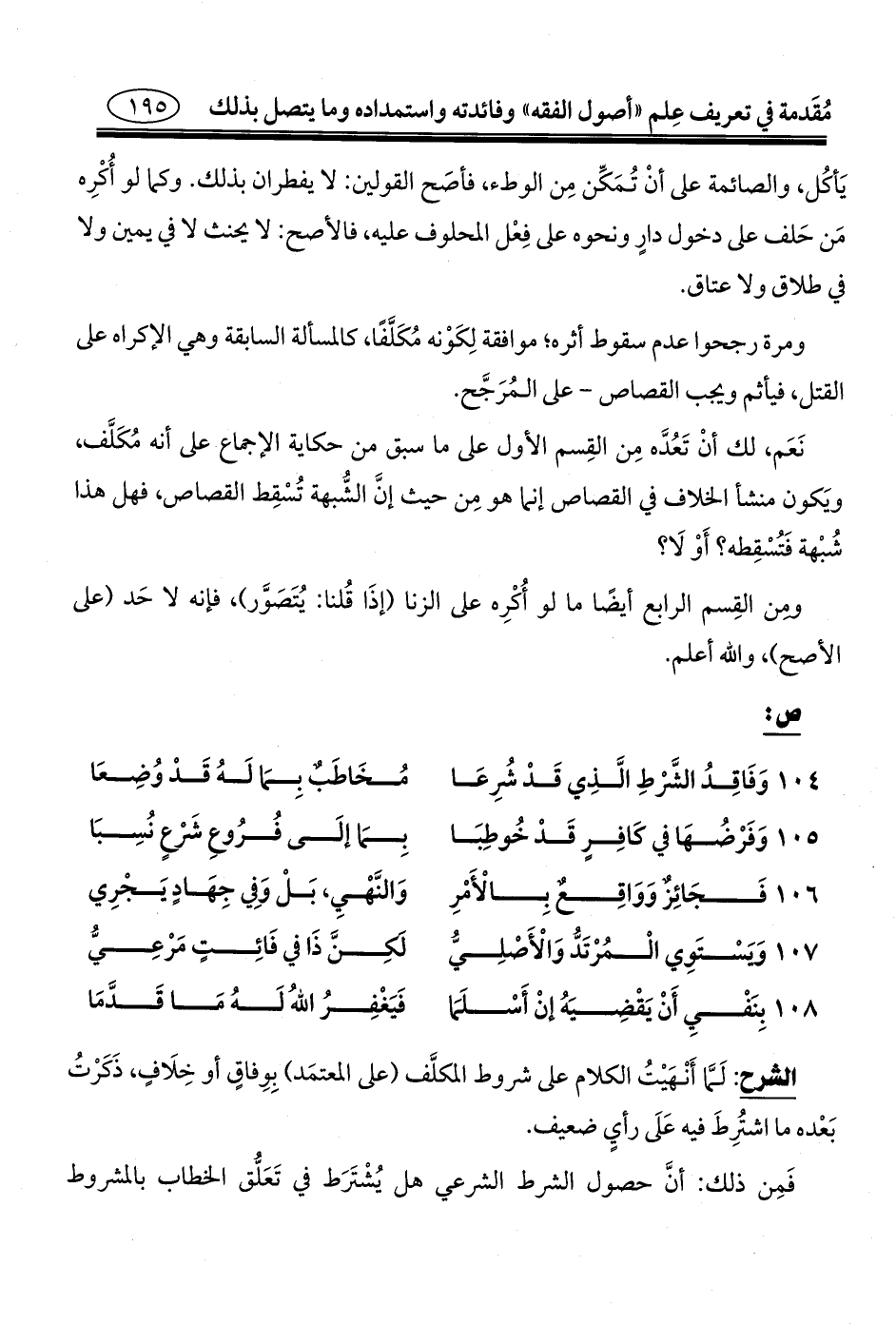 الشرح: لَمَّا أَنْهَيْتُ الكلام على شروط المكلَّف (على المعتمَد) بِوِفاقٍ أو خِلَافٍ، ذَكَرْتُ بَعْده ما اشتُرِطَ فيه عَلَى رأيٍ ضعيف.