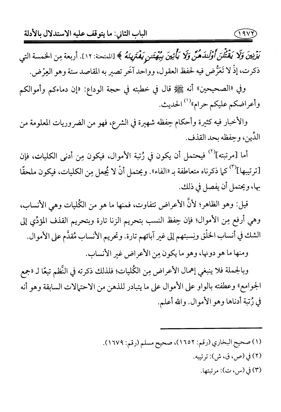 وبالجملة فلا ينبغي إهمال الأعراض مِن الكُليات؛ فلذلك ذكرته في النَّظم تبعًا لـ "جمع الجوامع" وعطفته بالواو على الأموال على ما يتبادر للذهن من الاحتمالات السابقة وهو أنه في رُتبة أدناها وهو الأموال. والله أعلم.