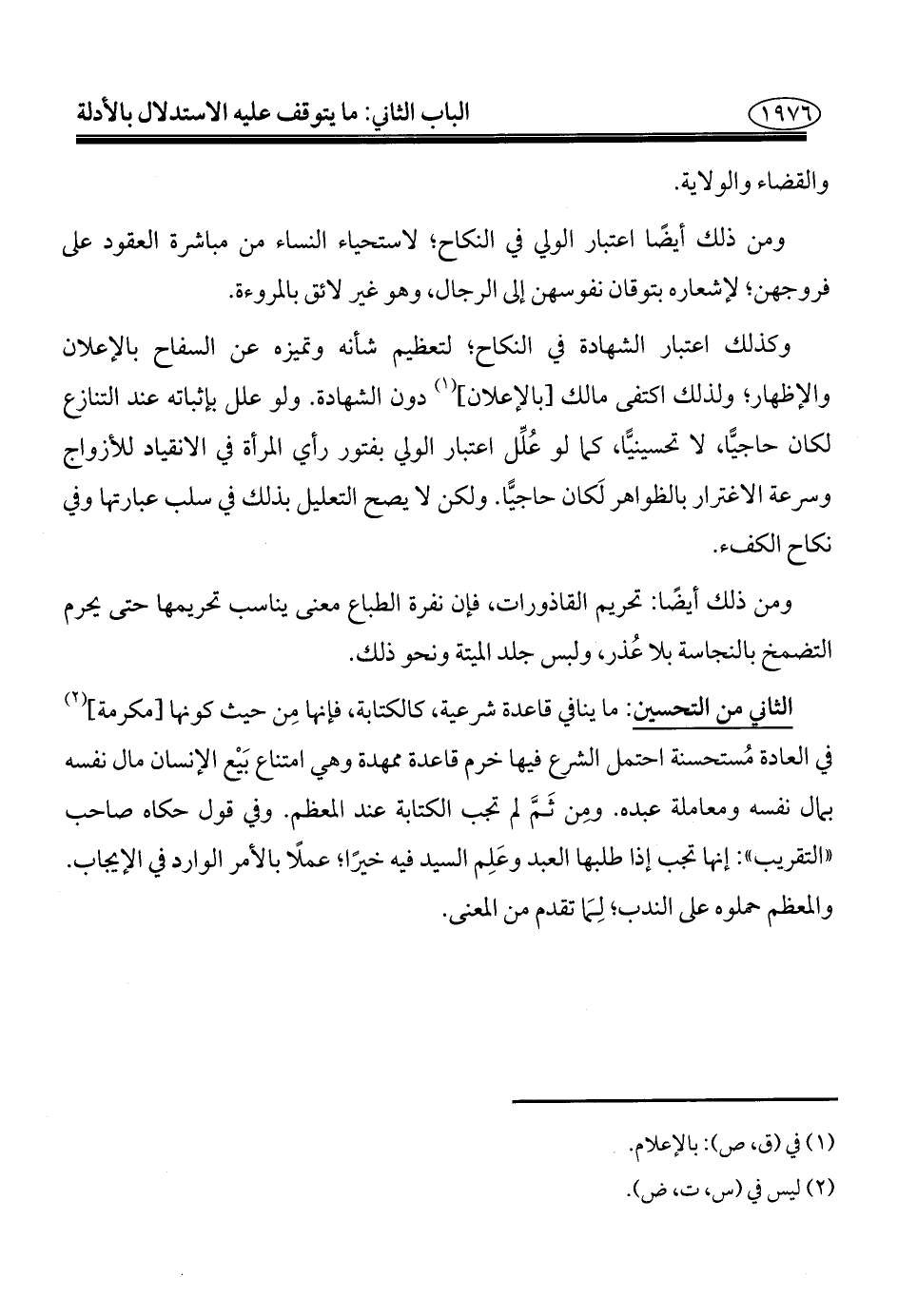 وكذلك اعتبار الشهادة في النكاح؛ لتعظيم شأنه وتميزه عن السفاح بالإعلان والإظهار؛ ولذلك اكتفى مالك [بالإعلان] (¬١) دون الشهادة. ولو علل بإثباته عند التنازع لكان حاجيًّا، لا تحسينيًّا، كما لو عُلِّل اعتبار الولي بفتور رأي المرأة في الانقياد للأزواج وسرعة الاغترار بالظواهر لَكان حاجيًّا. ولكن لا يصح التعليل بذلك في سلب عبارتها وفي نكاح الكفء.