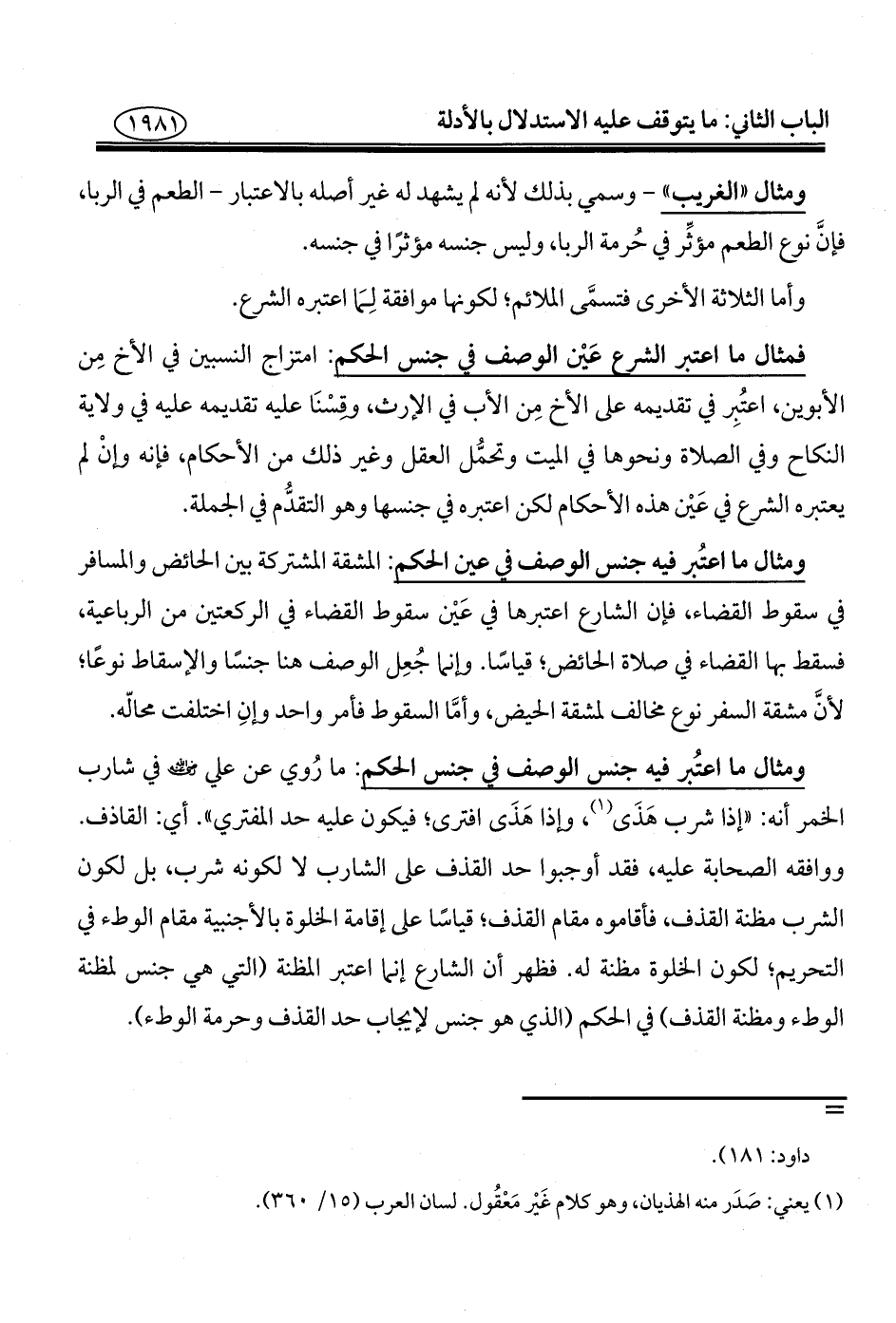 ومثال ما اعتُبر فيه جنس الوصف فى جنس الحكم: ما رُوي عن علي - رضي الله عنه - في شارب الخمر أنه: "إذا شرب هَذَى (¬١)، وإذا هَذَى افترى؛ فيكون عليه حد المفتري". أي: القاذف. ووافقه الصحابة عليه، فقد أوجبوا حد القذف على الشارب لا لكونه شرب، بل لكون الشرب مظنة القذف، فأقاموه مقام القذف؛ قياسًا على إقامة الخلوة بالأجنبية مقام الوطء في التحريم؛ لكون الخلوة مظنة له. فظهر أن الشارع إنما اعتبر المظنة (التي هي جنس لمظنة الوطء ومظنة القذف) في الحكم (الذي هو جنس لإيجاب حد القذف وحرمة الوطء).