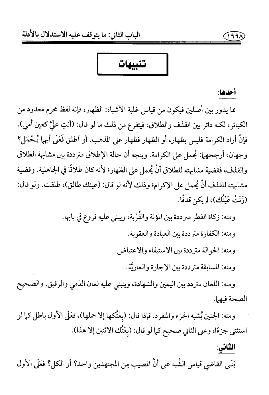 مما يدور بين أصلين فيكون من قياس غلبة الأشباه: الظهار، فإنه لفظ محرم معدود من الكبائر، لكنه دائر بين القذف والطلاق، فيتفرع من ذلك ما لو قال: (أنتِ علَيَّ كعين أمي). فإنْ أراد الكرامة فليس بظهار، أو الظهار فظهار على المذهب. أو أطلق فَعَلَى أيهما يُحْمَل؟ وجهان، أرجحهما: يُحمل على الكرامة. ويتجه أن حالة الإطلاق مترددة بين مشابهة الطلاق والقذف، فقضية مشابهته للطلاق أنْ يُحمل على الظهار؛ لأنه كان طلاقًا في الجاهلية. وقضية مشابهته للقذف أنْ يُحمل على الإكرام؛ وذلك لأنه لو قال: (عينك طالق)، طلقت. ولو قال: (زَنَتْ عَيْنك)، لم يكن قذفًا.