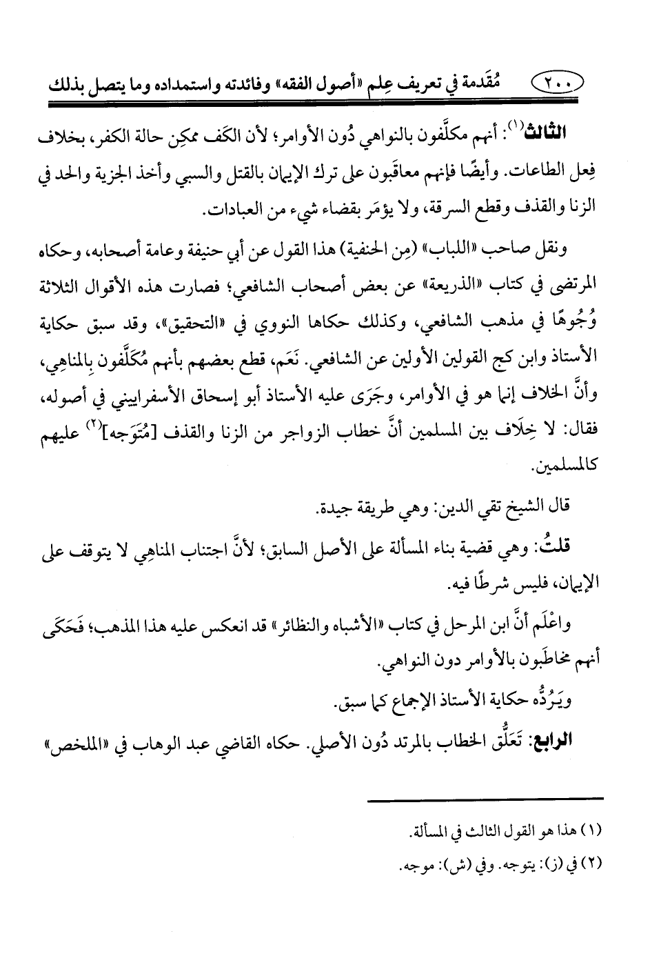 الثالث (¬١): أنهم مكلَّفون بالنواهي دُون الأوامر؛ لأن الكَف ممكِن حالة الكفر، بخلاف فِعل الطاعات. وأيضًا فإنهم معاقَبون على ترك الإيمان بالقتل والسبي وأخذ الجزية والحد في الزنا والقذف وقطع السرقة، ولا يؤمَر بقضاء شيء من العبادات.