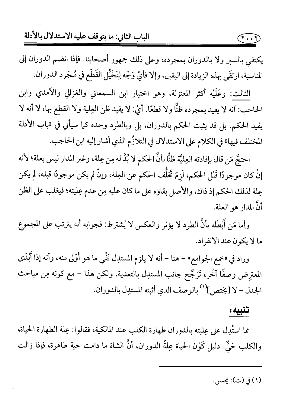 الثالث: وعَلَيْه أكثر المعتزلة، وهو اختيار ابن السمعاني والغزالي والآمدي وابن الحاجب: أنه لا يفيد بمجرده ظنًّا ولا قطعًا. أيْ: لا يفيد ظن العِلية ولا القطع بها، لا أنه لا يفيد الحكم. بل قد يثبت الحكم بالدوران، بل وبالطرد وحده كما سيأتي في "باب الأدلة المختلف فيها" في الكلام على الاستدلال في التلازُم الذي أشار إليه ابن الحاجب.