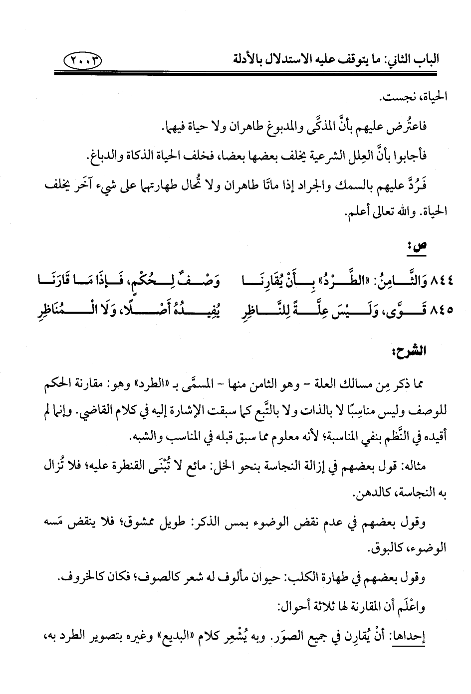 مما ذكر مِن مسالك العلة - وهو الثامن منها - المسمَّى بـ "الطرد" وهو: مقارنة الحكم للوصف وليس مناسِبًا لا بالذات ولا بالتَّبع كما سبقت الإشارة إليه في كلام القاضي. وإنما لم أقيده في النَّظم بنفي المناسبة؛ لأنه معلوم مما سبق قبله في المناسب والشبه.