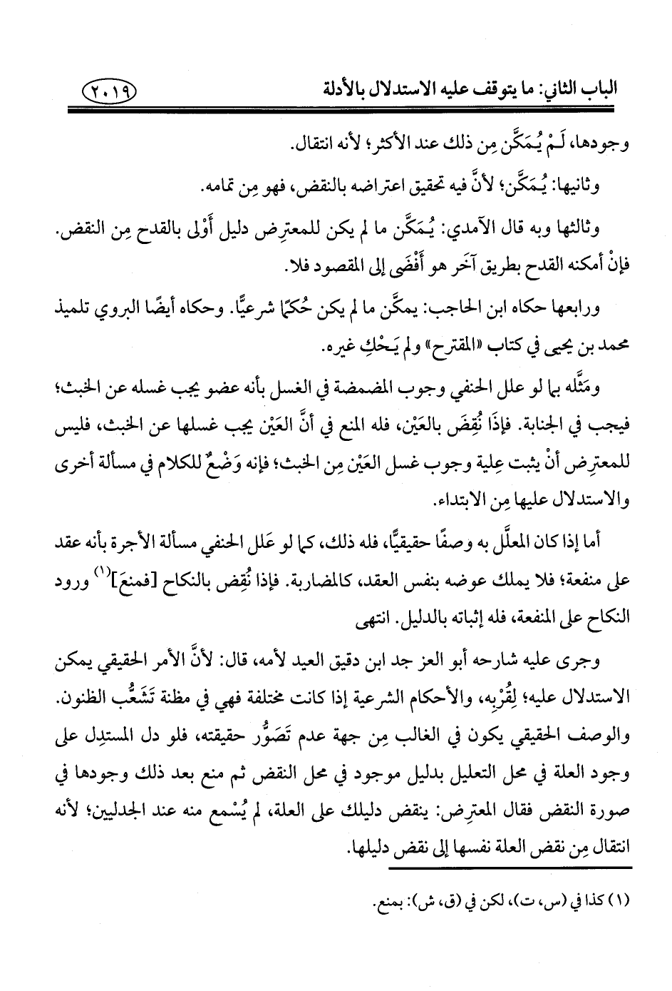 وجرى عليه شارحه أبو العز جد ابن دقيق العيد لأمه، قال: لأنَّ الأمر الحقيقي يمكن الاستدلال عليه؛ لِقُرْبِه، والأحكام الشرعية إذا كانت مختلفة فهي في مظنة تَشَعُّب الظنون. والوصف الحقيقي يكون في الغالب مِن جهة عدم تَصَوُّر حقيقته، فلو دل المستدِل على وجود العلة في محل التعليل بدليل موجود في محل النقض ثم منع بعد ذلك وجودها في صورة النقض فقال المعترِض: ينقض دليلك على العلة، لم يُسْمع منه عند الجدليين؛ لأنه انتقال مِن نقض العلة نفسها إلى نقض دليلها.