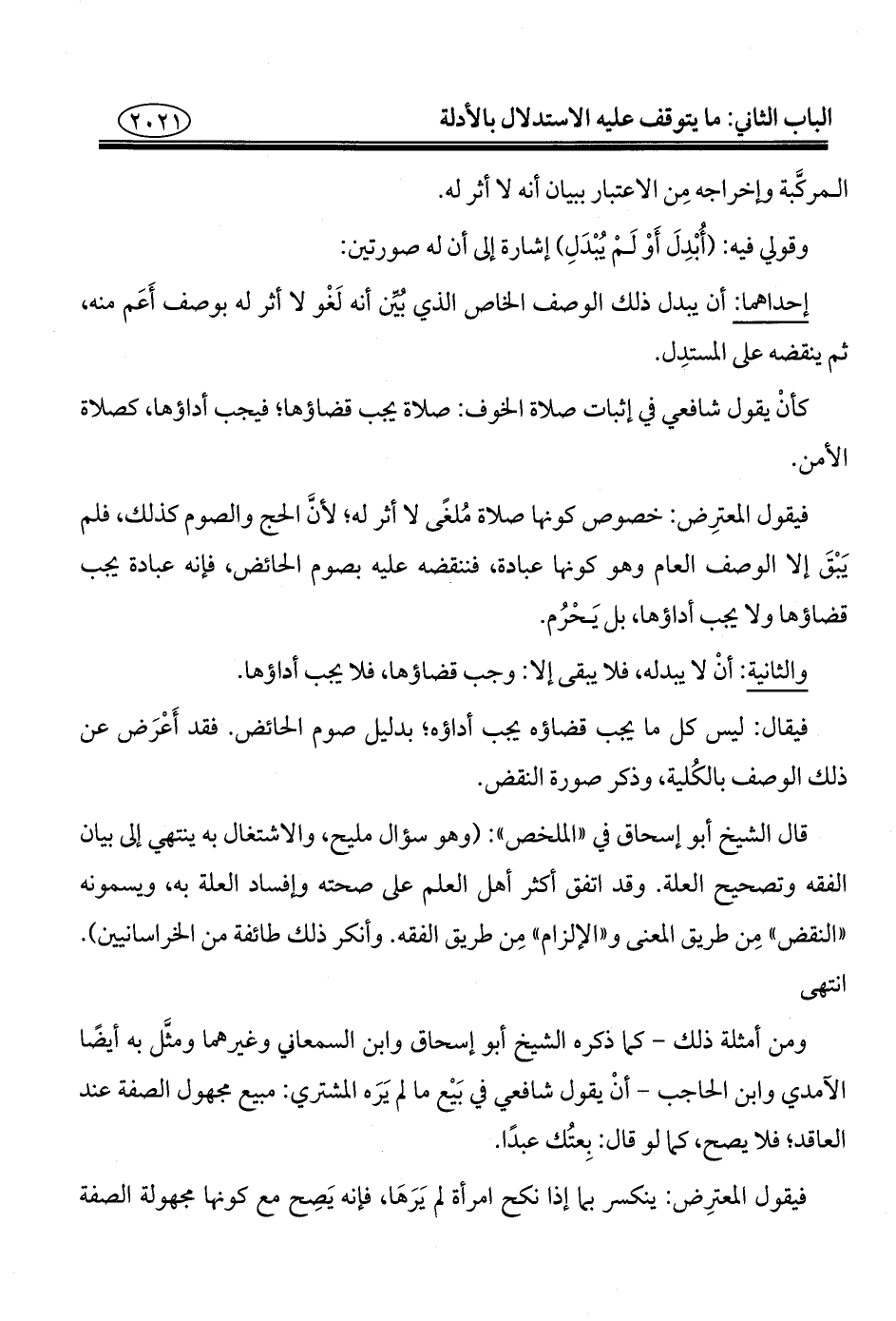 فيقول المعترِض: خصوص كونها صلاة مُلغًى لا أثر له؛ لأنَّ الحج والصوم كذلك، فلم يَبْقَ إلا الوصف العام وهو كونها عبادة، فننقضه عليه بصوم الحائض، فإنه عبادة يجب قضاؤها ولا يجب أداؤها، بل يَحْرُم.