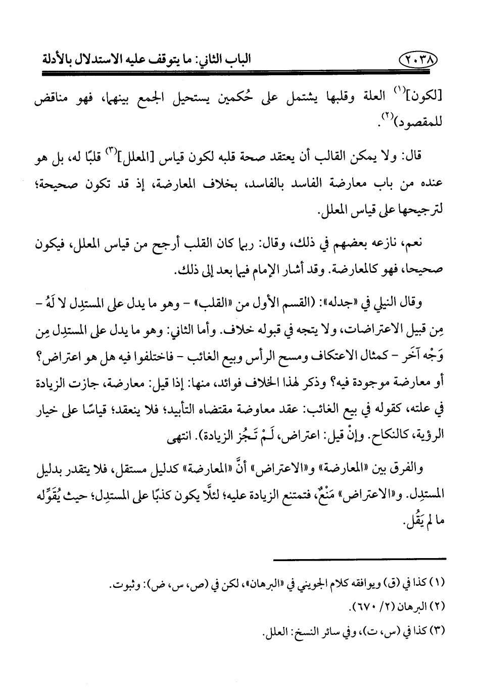 وقال النيلي في "جدله": (القسم الأول من "القلب" -وهو ما يدل على المستدِل لا لَهُ- مِن قبيل الاعتراضات، ولا يتجه في قبوله خلاف. وأما الثاني: وهو ما يدل على المستدِل مِن وَجْه آخَر -كمثال الاعتكاف ومسح الرأس وبيع الغائب- فاختلفوا فيه هل هو اعتراض؟ أو معارضة موجودة فيه؟ وذكر لهذا الخلاف فوائد، منها: إذا قيل: معارضة، جازت الزيادة في علته، كقوله في بيع الغائب: عقد معاوضة مقتضاه التأبيد؛ فلا ينعقد؛ قياسًا على خيار الرؤية، كالنكاح. وإنْ قيل: اعتراض، لَمْ تَجُز الزيادة). انتهى