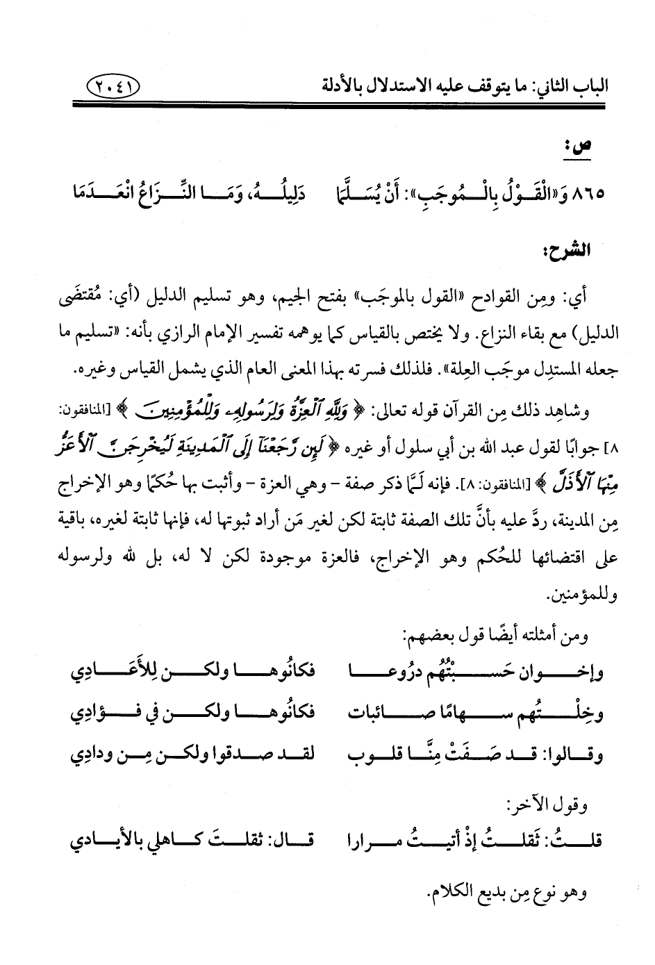 ٨٦٥ - وَ"الْقَوْلُ بِالْمُوجَبِ": أَنْ يُسَلَّمَا ... دَلِيلُهُ، وَمَا النِّزَاعُ انْعَدَمَا