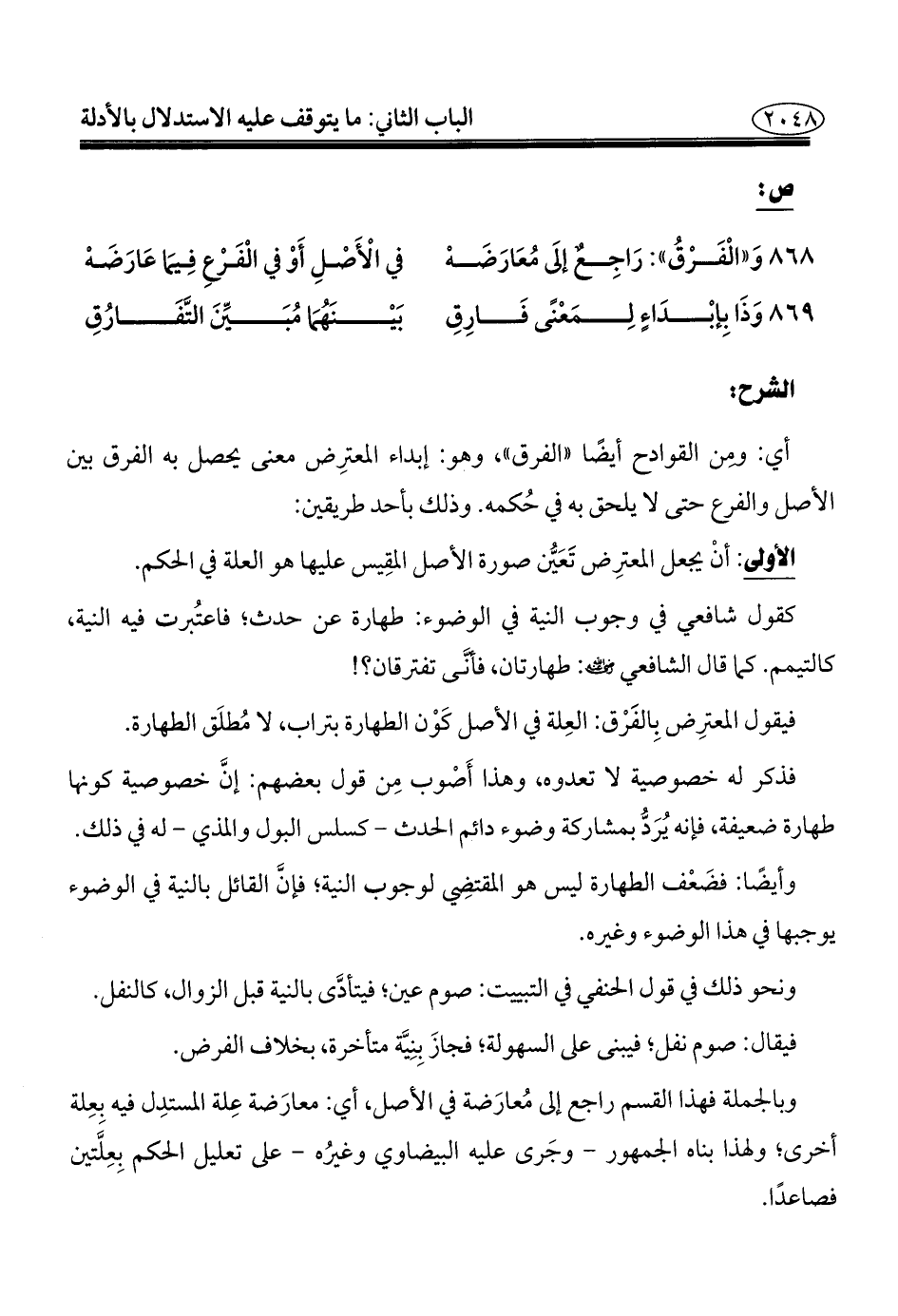 ٨٦٨ - وَ"الْفَرْقُ": رَاجِعٌ إلَى مُعَارَضهْ ... في الْأَصْلِ أَوْ في الْفَرْعِ فِيمَا عَارَضَهْ