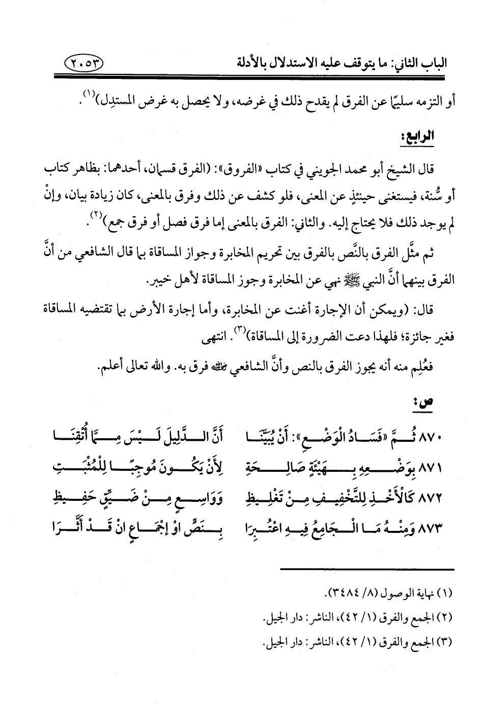 قال الشيخ أبو محمد الجويني في كتاب "الفروق": (الفرق قسمان، أحدهما: بظاهر كتاب أو سُّنة، فيستغنى حينئذٍ عن المعنى، فلو كشف عن ذلك وفرق بالمعنى، كان زيادة بيان، وإنْ لم يوجد ذلك فلا يحتاج إليه. والثاني: الفرق بالمعنى إما فرق فصل أو فرق جمع) (¬٢).