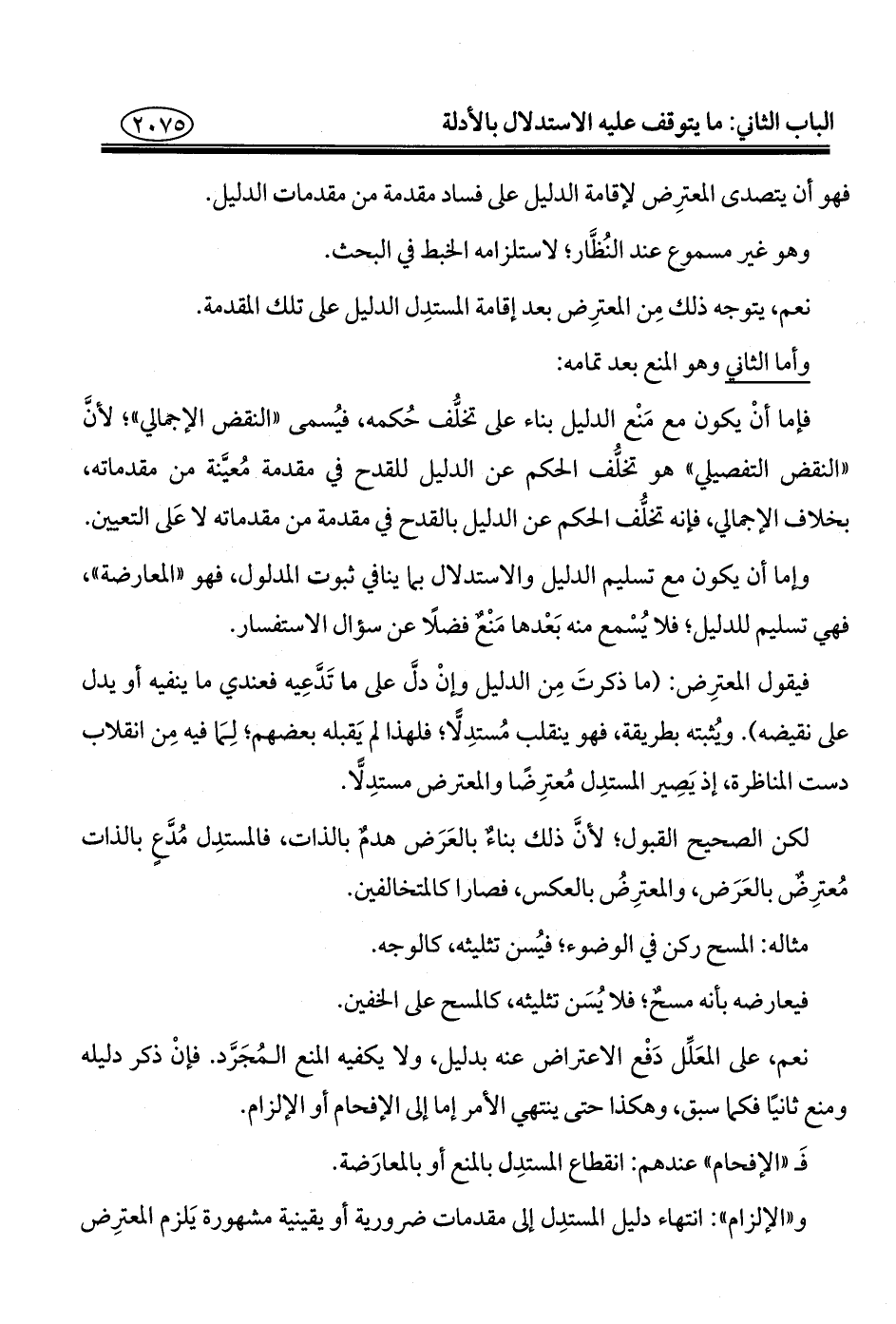 وإما أن يكون مع تسليم الدليل والاستدلال بما ينافي ثبوت المدلول، فهو "المعارضة"، فهي تسليم للدليل؛ فلا يُسْمع منه بَعْدها مَنْعٌ فضلًا عن سؤال الاستفسار.
