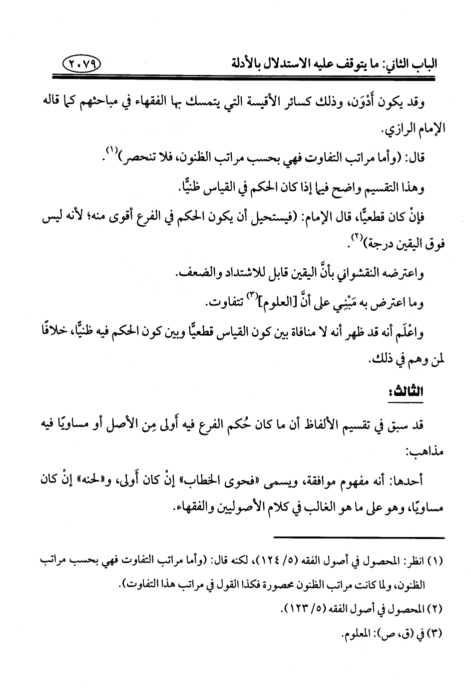 (¬١) انظر: المحصول في أصول الفقه (٥/ ١٢٤)، لكنه قال: (وأما مراتب التفاوت فهي بحسب مراتب الظنون، ولما كانت مراتب الظنون محصورة فكذا القول في مراتب هذا التفاوت).
