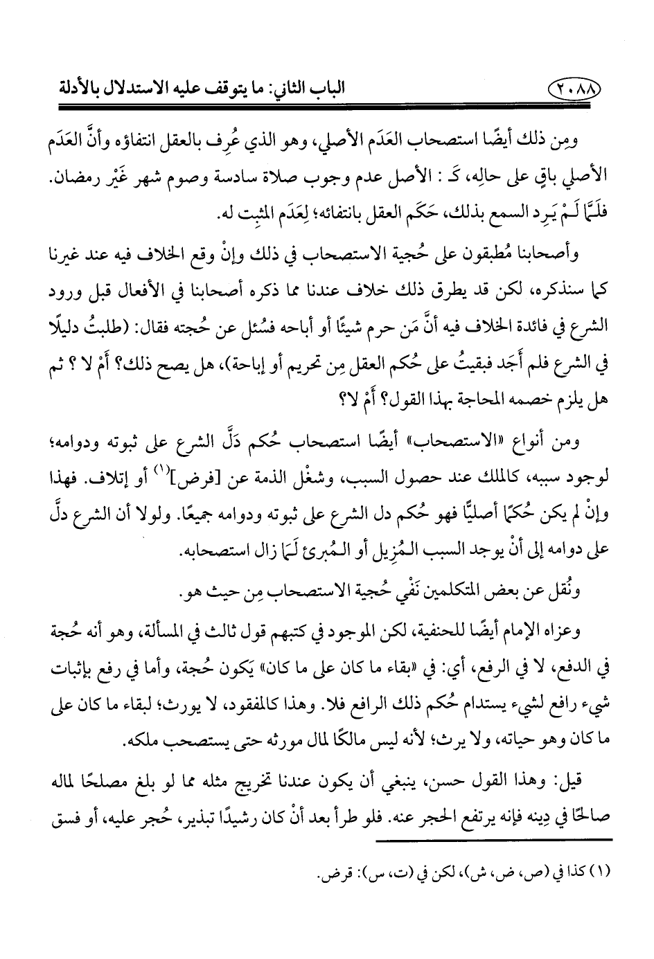وعزاه الإمام أيضًا للحنفية، لكن الموجود في كتبهم قول ثالث في المسألة، وهو أنه حُجة في الدفع، لا في الرفع، أي: في "بقاء ما كان على ما كان" يَكون حُجة، وأما في رفع بإثبات شيء رافع لشيء يستدام حُكم ذلك الرافع فلا. وهذا كالمفقود، لا يورث؛ لبقاء ما كان على ما كان وهو حياته، ولا يرث؛ لأنه ليس مالكًا لمال مورثه حتى يستصحب ملكه.