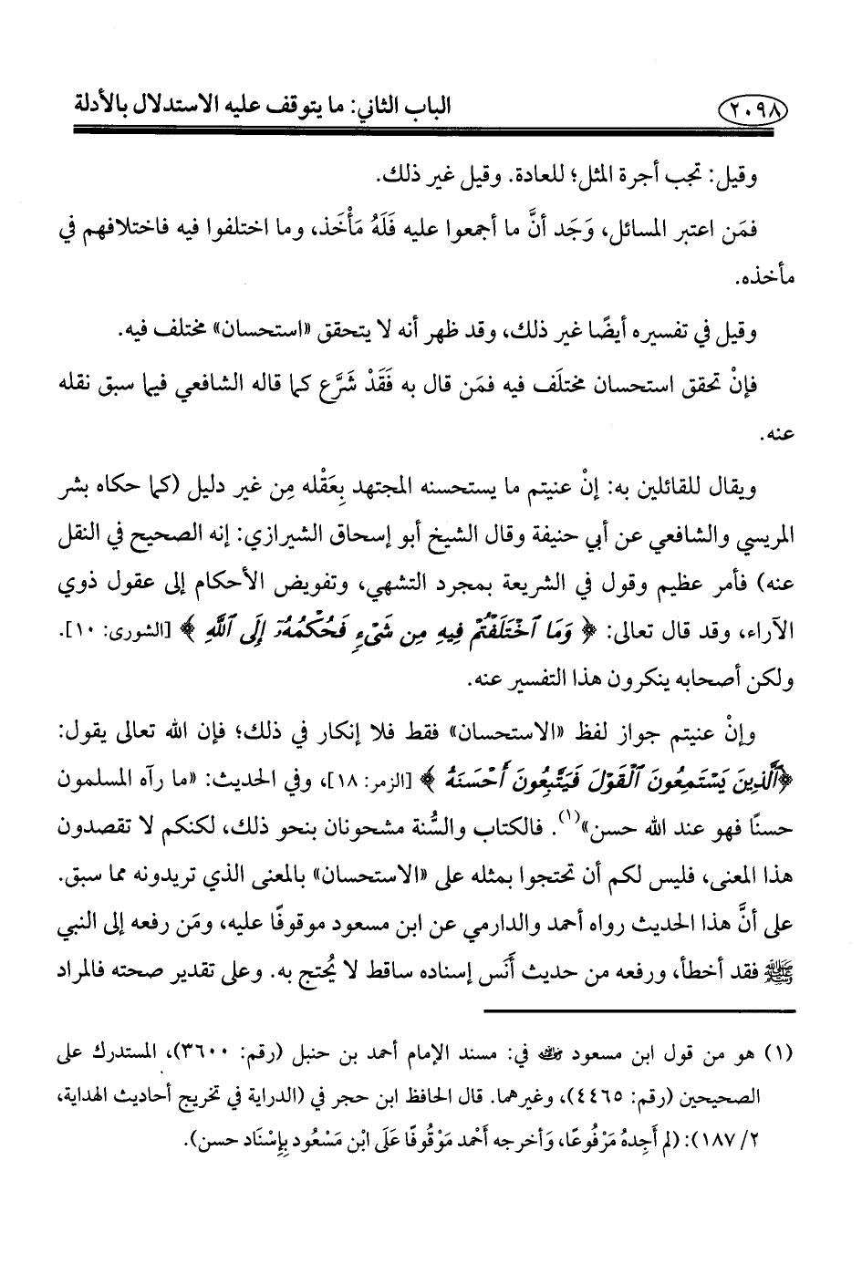 وإنْ عنيتم جواز لفظ "الاستحسان" فقط فلا إنكار في ذلك؛ فإن الله تعالى يقول: {الَّذِينَ يَسْتَمِعُونَ الْقَوْلَ فَيَتَّبِعُونَ أَحْسَنَهُ} [الزمر: ١٨]، وفي الحديث: "ما رآه المسلمون حسنًا فهو عند الله حسن" (¬١). فالكتاب والسُّنة مشحونان بنحو ذلك، لكنكم لا تقصدون هذا المعنى، فليس لكم أن تحتجوا بمثله على "الاستحسان" بالمعنى الذي تريدونه مما سبق. على أنَّ هذا الحديث رواه أحمد والدارمي عن ابن مسعود موقوفًا عليه، ومَن رفعه إلى النبي - صلى الله عليه وسلم - فقد أخطأ، ورفعه من حديث أَنَس إسناده ساقط لا يُحتج به. وعلى تقدير صحته فالمراد