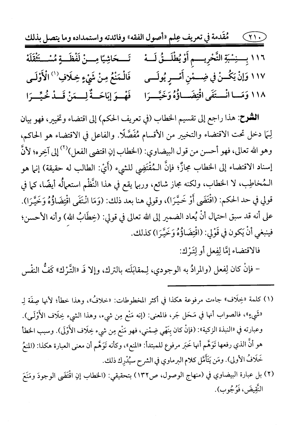 (¬٢) بل عبارة البيضاوي في (منهاج الوصول، ص ١٣٢) بتحقيقي: (الخطاب إنِ اقْتَضَى الوجودَ ومَنَعَ النَّقِيضَ، فَوُجُوب).
