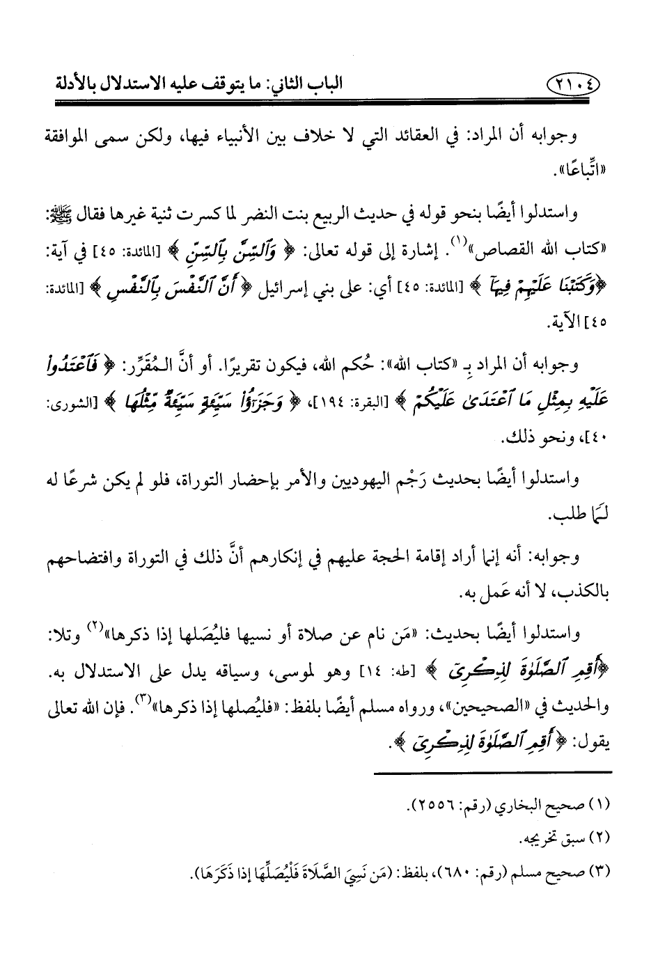 وجوابه أن المراد بِـ "كتاب الله": حُكم الله، فيكون تقريرًا. أو أنَّ المُقَرِّر: {فَاعْتَدُوا عَلَيْهِ بِمِثْلِ مَا اعْتَدَى عَلَيْكُمْ} [البقرة: ١٩٤]، {وَجَزَاءُ سَيِّئَةٍ سَيِّئَةٌ مِثْلُهَا} [الشورى: ٤٠]، ونحو ذلك.