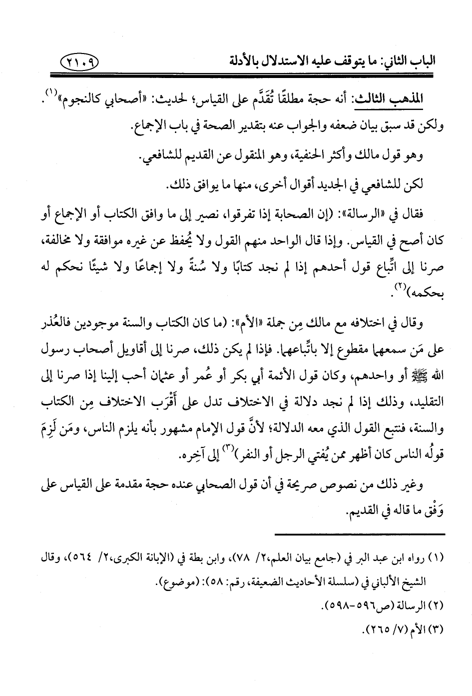المذهب الثالث: أنه حجة مطلقًا تُقَدَّم على القياس؛ لحديث: "أصحابي كالنجوم" (¬١). ولكن قد سبق بيان ضعفه والجواب عنه بتقدير الصحة في باب الإجماع.