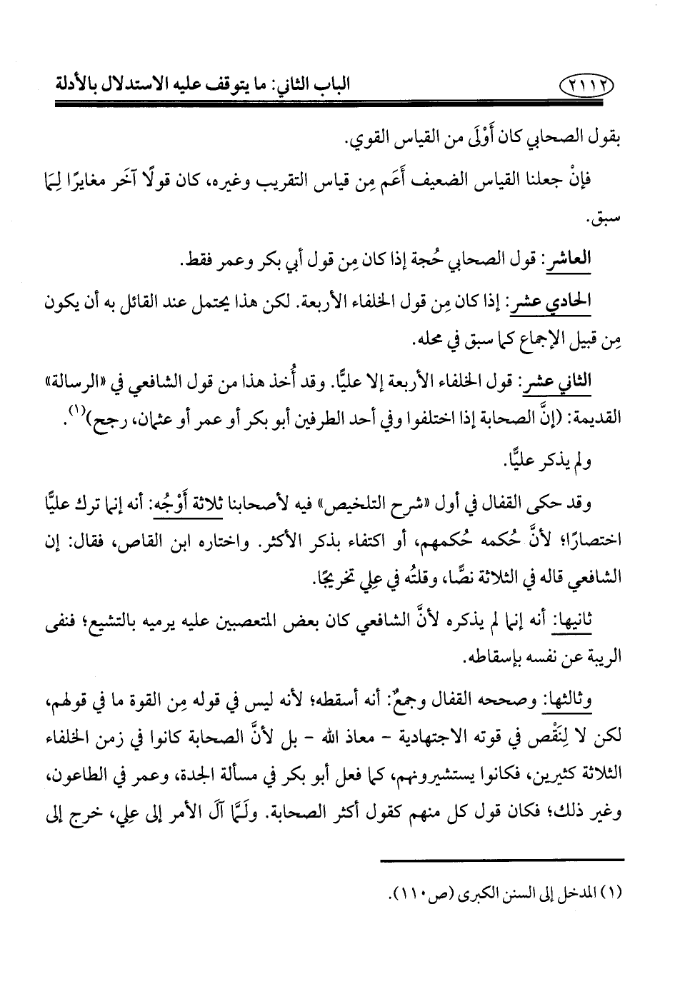 الثاني عشر: قول الخلفاء الأربعة إلا عليًّا. وقد أُخذ هذا من قول الشافعي في "الرسالة" القديمة: (إنَّ الصحابة إذا اختلفوا وفي أحد الطرفين أبو بكر أو عمر أو عثمان، رجح) (¬١).