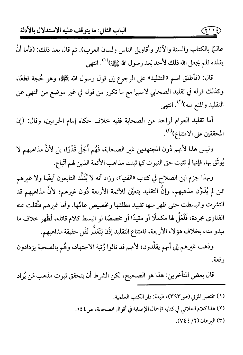 وبهذا جزم ابن الصلاح في كتاب "الفتيا"، وزاد أنه لا يُقَلَّد التابعون أيضًا ولا غيرهم ممن لم يُدَوَّن مذهبهم، وإنَّ التقليد يتعيَّن للأئمة الأربعة دُون غيرهم؛ لأنَّ مذاهبهم قد انتشرت وانبسطت حتى ظهر منها تقييد مطلقها وتخصيص عامِّها. وأما غيرهم فنُقلت عنه الفتاوى مجردة، فَلَعَلَّ لها مكملًا أو مقيدًا أو مخصصًا لو انبسط كلام قائله، لَظَهر خلاف ما يبدو منه، بخلاف هؤلاء الأربعة، فامتناع التقليد إذَن لِتَعَذُّر نَقْل حقيقة مذاهبهم.