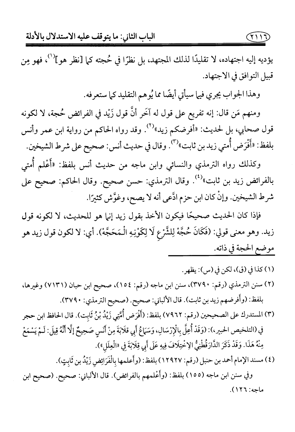 فإذا كان الحديث صحيحًا فيكون الأخذ بقول زيد إنما هو للحديث، لا لكونه قول زيد. وهو معنى قولي: (فكَانَ حُجَّهْ لِلشَّرْعِ لَا لِكَوْنِهِ الْمَحَجَّهْ). أي: لا لكون قول زيد هو موضع الحجة في ذاته.