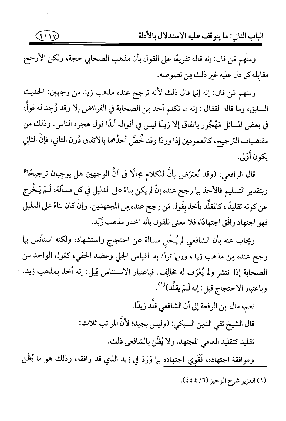 قال الرافعي: (وقد يُعترَض بأنَّ للكلام مجالًا في أنَّ الوجهين هل يوجِبان ترجيحًا؟ وبتقدير التسليم فالأخذ بما رجح عنده إنْ لم يكن بناءً على الدليل في كل مسألة، لَمْ يَخْرج عن كونه تقليدًا، كالمقلِّد يأخذ بِقَول مَن رجح عنده مِن المجتهدين. وإنْ كان بناءً على الدليل فهو اجتهاد وافَق اجتهادًا، فلا معنى للقول بأنه اختار مذهب زيد.