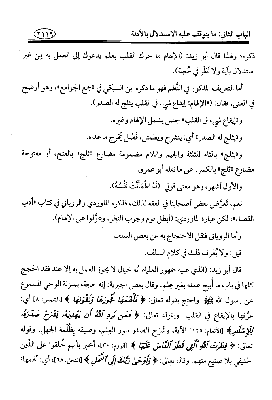 قال أبو زيد: (الذي عليه جمهور العلماء أنه خيال لا يجوز العمل به إلا عند فقد الحجج كلها في باب ما أُبيح عمله بغير عِلم. وقال بعض الجبرية: إنه حجة، بمنزلة الوحي المسموع عن رسول الله - صلى الله عليه وسلم -. واحتج بقوله تعالى: {فَأَلْهَمَهَا فُجُورَهَا وَتَقْوَاهَا} [الشمس: ٨] أي: عرَّفها بالإيقاع في القلب. وبقوله تعالى: {فَمَنْ يُرِدِ اللَّهُ أَنْ يَهْدِيَهُ يَشْرَحْ صَدْرَهُ لِلْإِسْلَامِ} [الأنعام: ١٢٥] الآية، وشَرْح الصدر بنور العِلم، وضيقه بِظُلْمة الجهل. وقوله تعالى: {فِطْرَتَ اللَّهِ الَّتِي فَطَرَ النَّاسَ عَلَيْهَا} [الروم: ٣٠]، أخبر بأنهم خُلقوا على الدِّين الحنيفي بلا صنيع منهم. وقال تعالى: {وَأَوْحَى رَبُّكَ إِلَى النَّحْلِ} [النحل: ٦٨]، أي: ألهمها؛