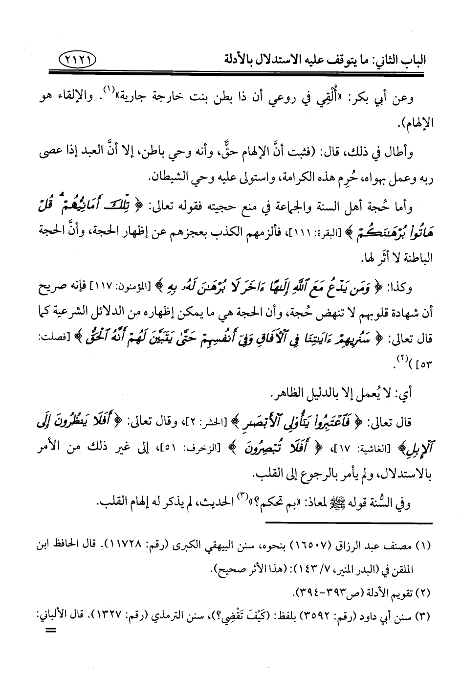 وفي السُّنة قوله - صلى الله عليه وسلم - لمعاذ: "بم تحكم؟ " (¬٣) الحديث، لم يذكر له إلهام القلب.