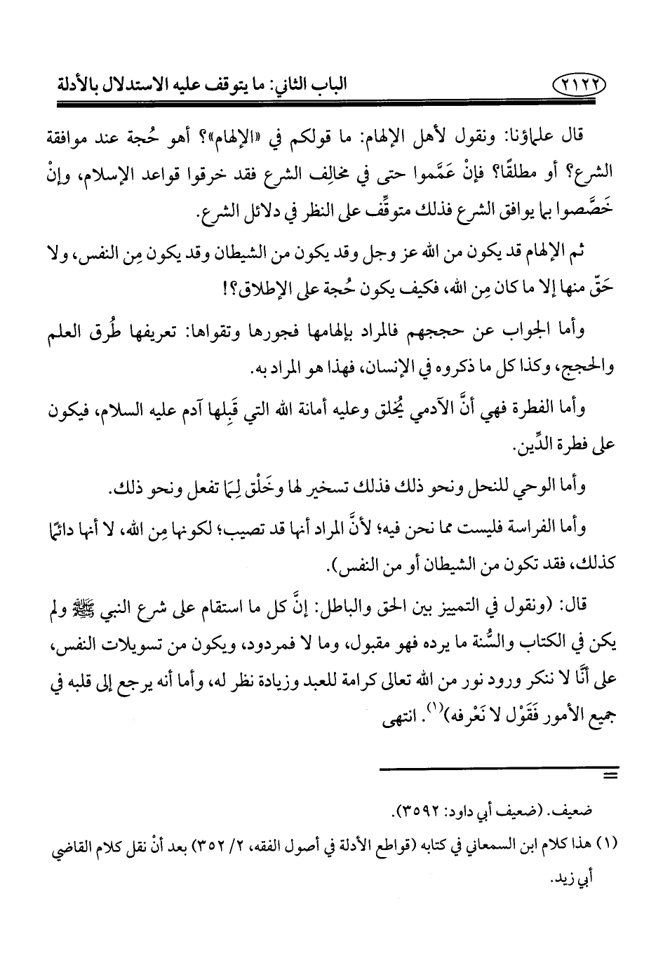قال علماؤنا: ونقول لأهل الإلهام: ما قولكم في "الإلهام"؟ أهو حُجة عند موافقة الشرع؟ أو مطلقًا؟ فإنْ عَمَّموا حتى في مخالِف الشرع فقد خرقوا قواعد الإسلام، وإنْ خَصَّصوا بما يوافق الشرع فذلك متوقَف على النظر في دلائل الشرع.