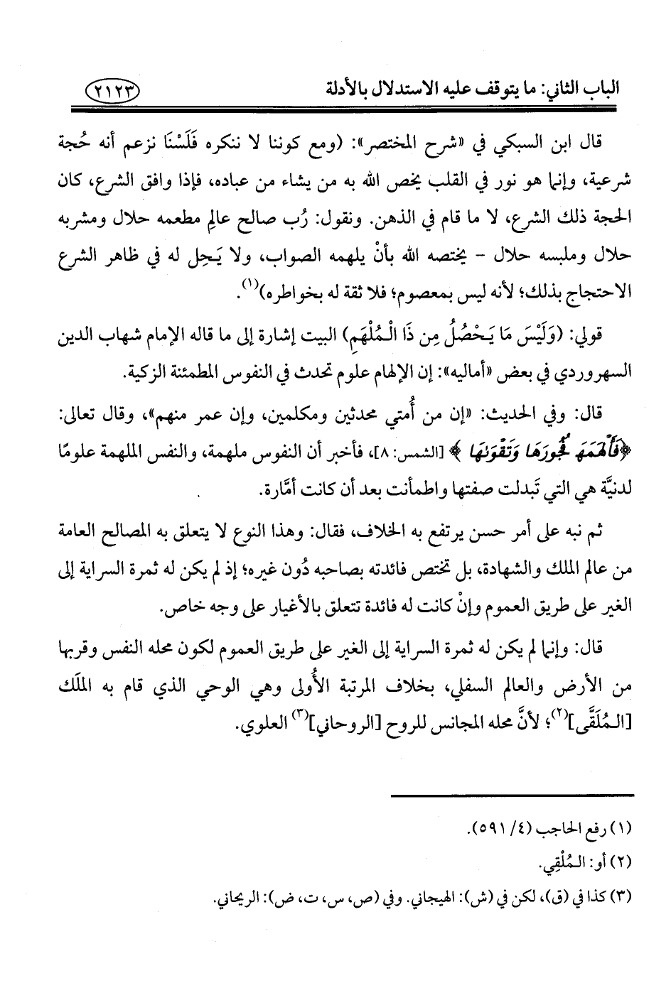 قال ابن السبكي في "شرح المختصر": (ومع كوننا لا ننكره فَلَسْنَا نزعم أنه حُجة شرعية، وإنما هو نور في القلب يخص الله به من يشاء من عباده، فإذا وافق الشرع، كان الحجة ذلك الشرع، لا ما قام في الذهن. ونقول: رُب صالح عالِم مطعمه حلال ومشربه حلال وملبسه حلال -يختصه الله بأنْ يلهمه الصواب، ولا يَحِل له في ظاهر الشرع الاحتجاج بذلك؛ لأنه ليس بمعصوم؛ فلا ثقة له بخواطره) (¬١).
