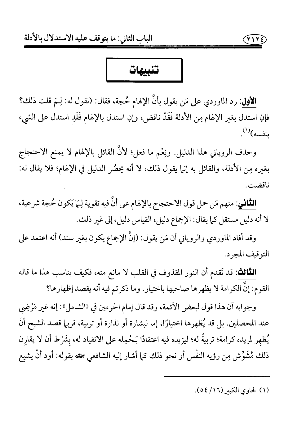 الأول: رد الماوردي على مَن يقول بأنَّ الإلهام حُجة، فقال: (نقول له: لِمَ قلت ذلك؟ فإنِ استدل بغير الإلهام مِن الأدلة فَقَدْ ناقض، وإنِ استدل بالإلهام فَقَدِ استدل على الشيء بنفسه) (¬١).