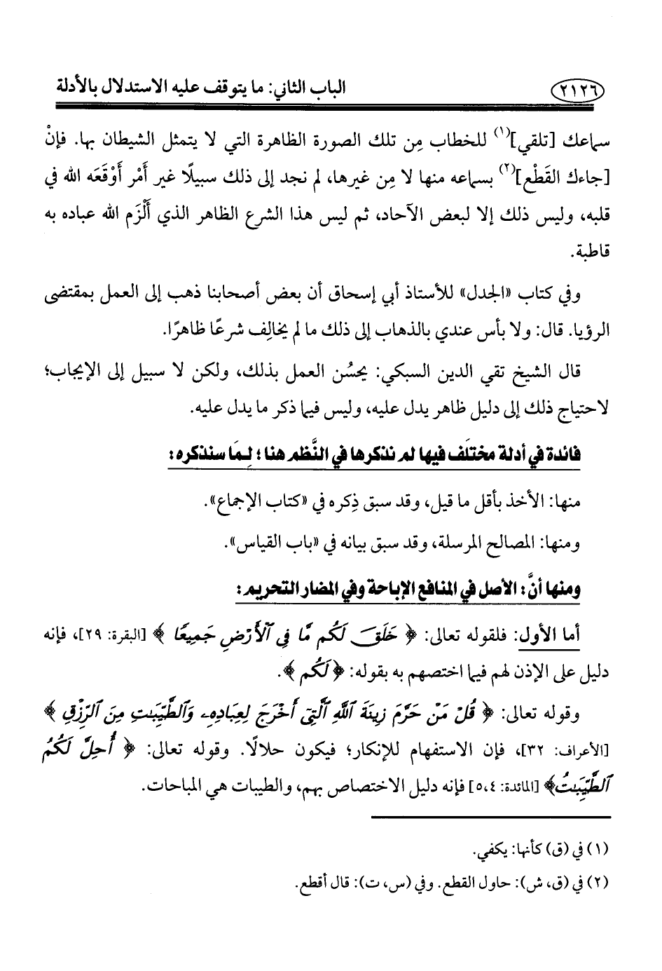 وقوله تعالى: {قُلْ مَنْ حَرَّمَ زِينَةَ اللَّهِ الَّتِي أَخْرَجَ لِعِبَادِهِ وَالطَّيِّبَاتِ مِنَ الرِّزْقِ} [الأعراف: ٣٢]، فإن الاستفهام للإنكار؛ فيكون حلالًا. وقوله تعالى: {أُحِلَّ لَكُمُ الطَّيِّبَاتُ} [المائدة: ٤، ٥] فإنه دليل الاختصاص بهم، والطيبات هي المباحات.