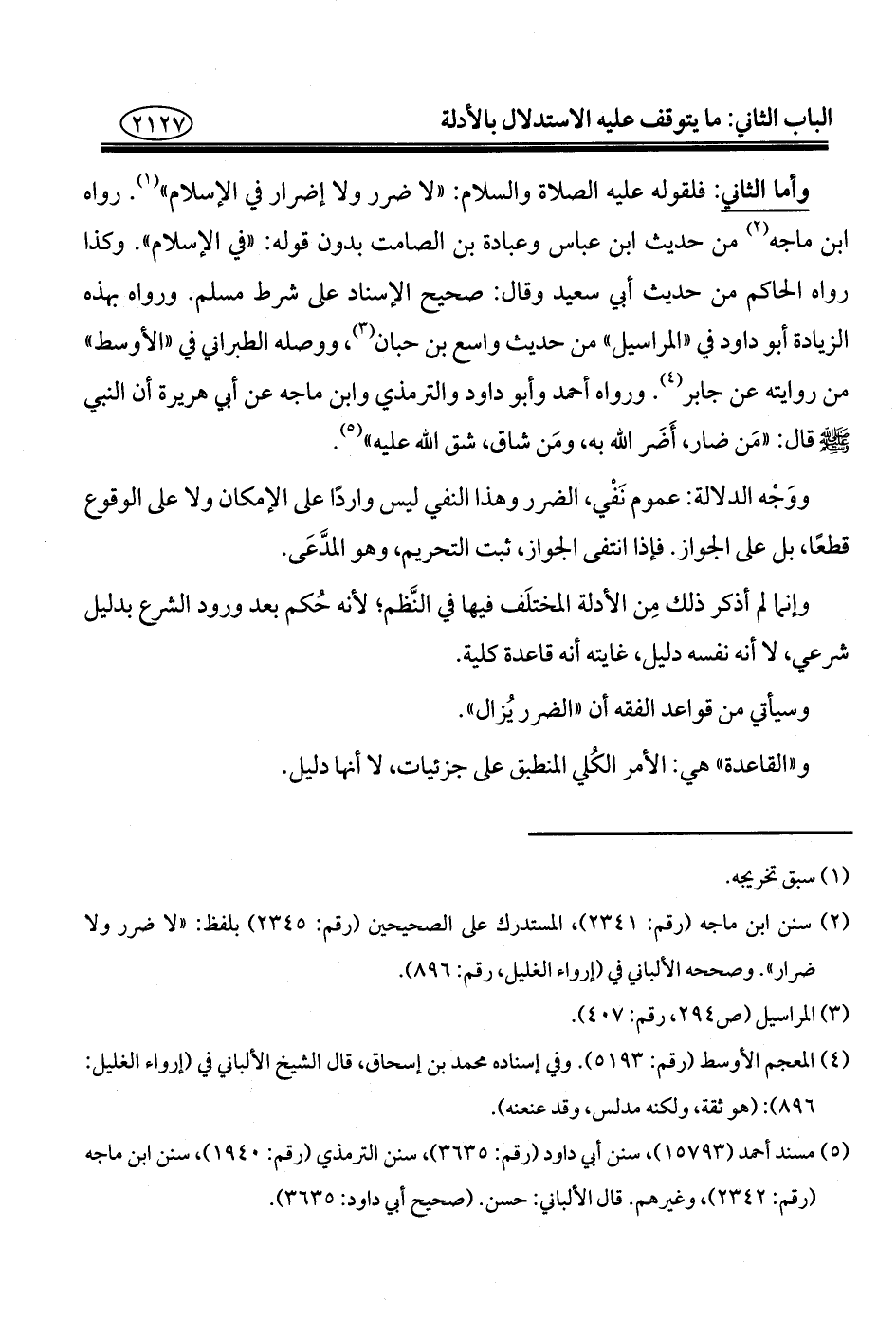 (¬٢) سنن ابن ماجه (رقم: ٢٣٤١)، المستدرك على الصحيحين (رقم: ٢٣٤٥) بلفظ: "لا ضرر ولا ضرار". وصححه الألباني في (إرواء الغليل، رقم: ٨٩٦).