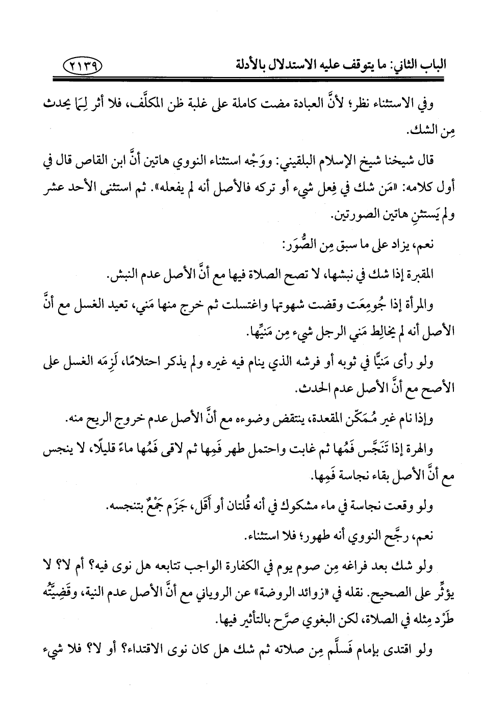 قال شيخنا شيخ الإسلام البلقيني: ووَجْه استثناء النووي هاتين أنَّ ابن القاص قال في أول كلامه: "مَن شك في فِعل شيء أو تركه فالأصل أنه لم يفعله". ثم استثنى الأحد عشر ولم يَستثنِ هاتين الصورتين.