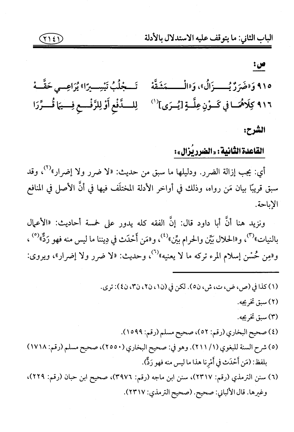 أي: يجب إزالة الضرر. ودليلها ما سبق من حديث: "لا ضرر ولا إضرار" (¬٢)، وقد سبق قريبًا بيان مَن رواه، وذلك في أواخر الأدلة المختلَف فيها في أنَّ الأصل في المنافع الإباحة.