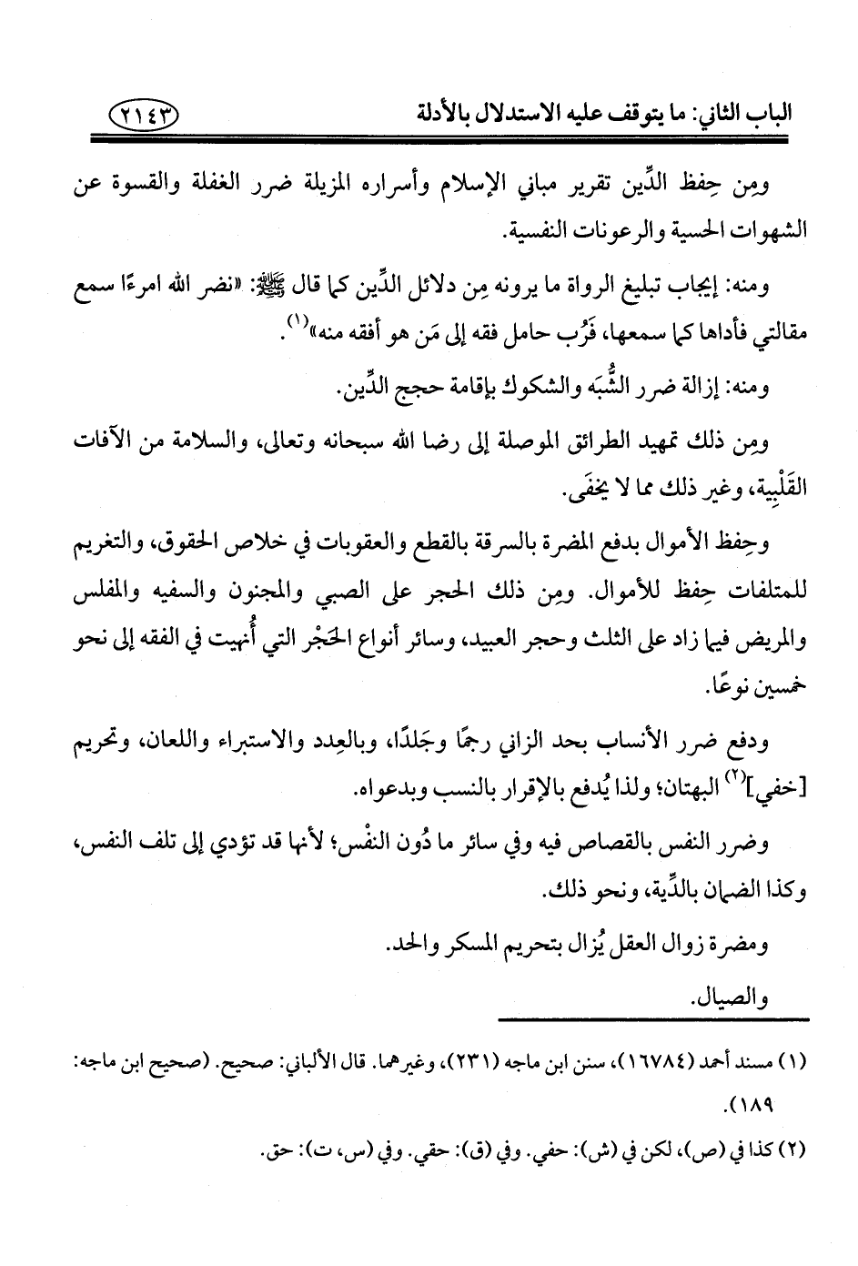 ومنه: إزالة ضرر الشُّبَه والشكوك بإقامة حجج الدِّين.