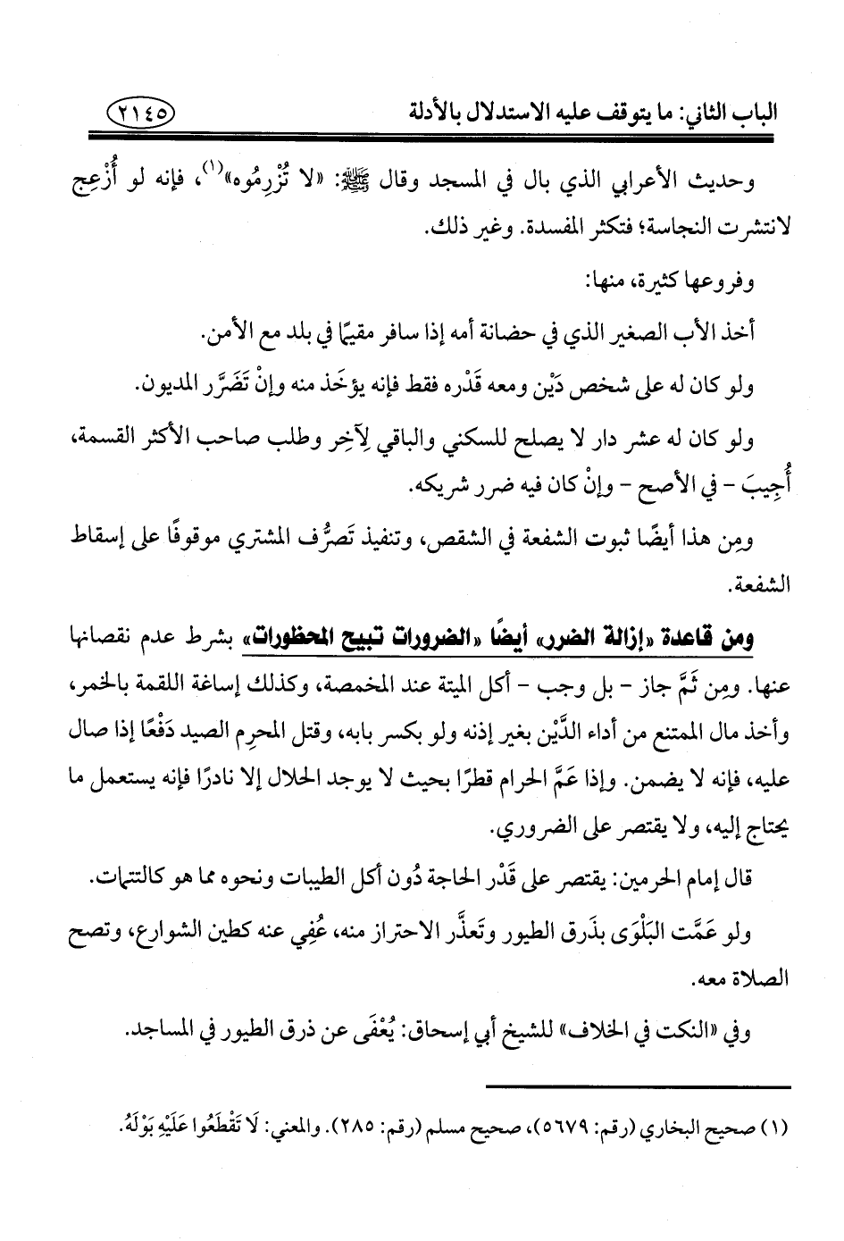 وحديث الأعرابي الذي بال في المسجد وقال - صلى الله عليه وسلم -: "لا تُزْرِمُوه" (¬١)، فإنه لو أُزْعِج لانتشرت النجاسة؛ فتكثر المفسدة. وغير ذلك.