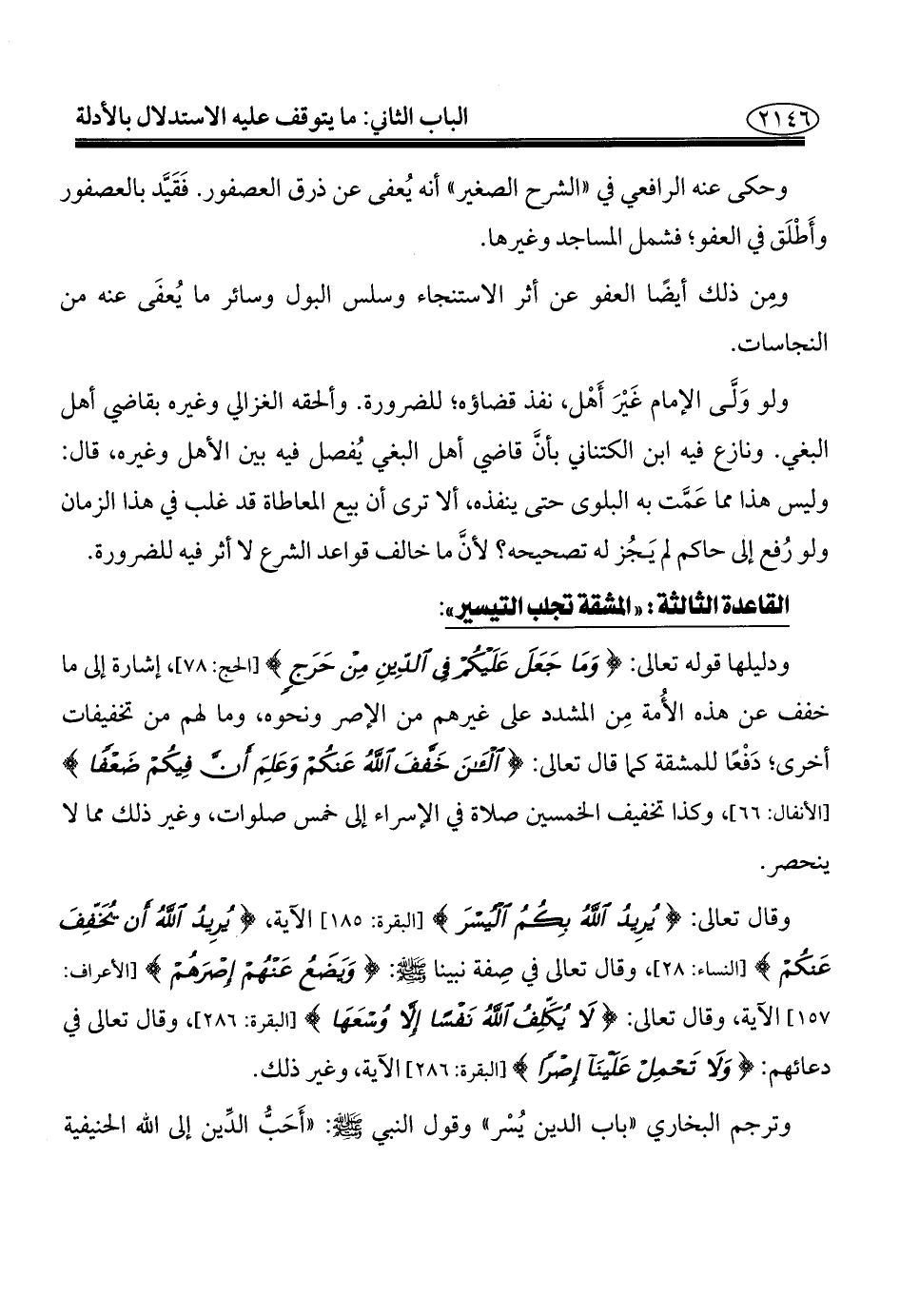 وقال تعالى: {يُرِيدُ اللَّهُ بِكُمُ الْيُسْرَ} [البقرة: ١٨٥] الآية، {يُرِيدُ اللَّهُ أَنْ يُخَفِّفَ عَنْكُمْ} [النساء: ٢٨]، وقال تعالى في صِفة نبينا - صلى الله عليه وسلم -: {وَيَضَعُ عَنْهُمْ إِصْرَهُمْ} [الأعراف: ١٥٧] الآية، وقال تعالى: {لَا يُكَلِّفُ اللَّهُ نَفْسًا إِلَّا وُسْعَهَا} [البقرة: ٢٨٦]، وقال تعالى في دعائهم: {وَلَا تَحْمِلْ عَلَيْنَا إِصْرًا} [البقرة: ٢٨٦] الآية، وغير ذلك.