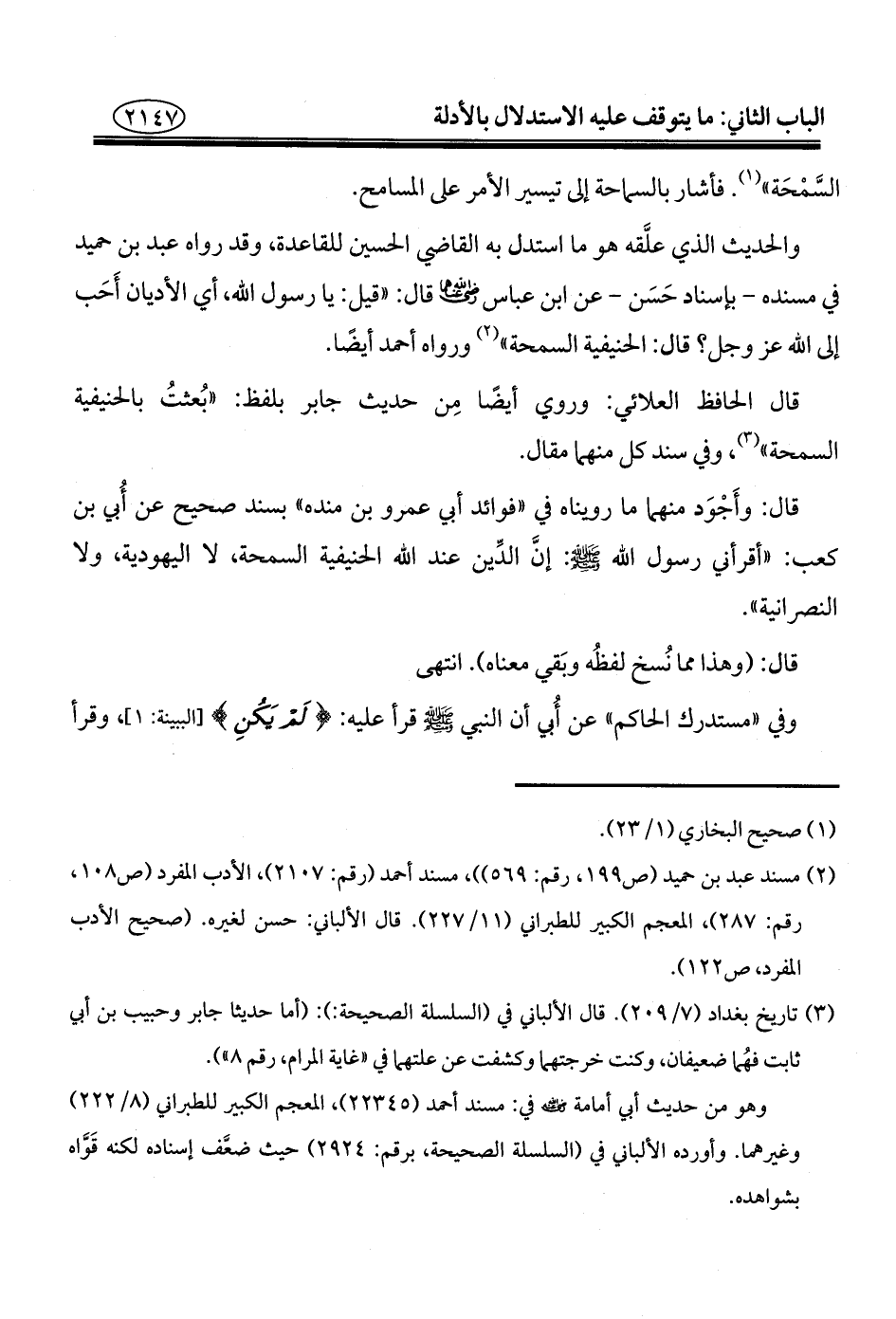 والحديث الذي علَّقه هو ما استدل به القاضي الحسين للقاعدة، وقد رواه عبد بن حميد في مسنده- بإسناد حَسَن- عن ابن عباس - رضي الله عنهما - قال: "قيل: يا رسول الله، أي الأديان أَحَب إلى الله عز وجل؟ قال: الحنيفية السمحة" (¬٢) ورواه أحمد أيضًا.