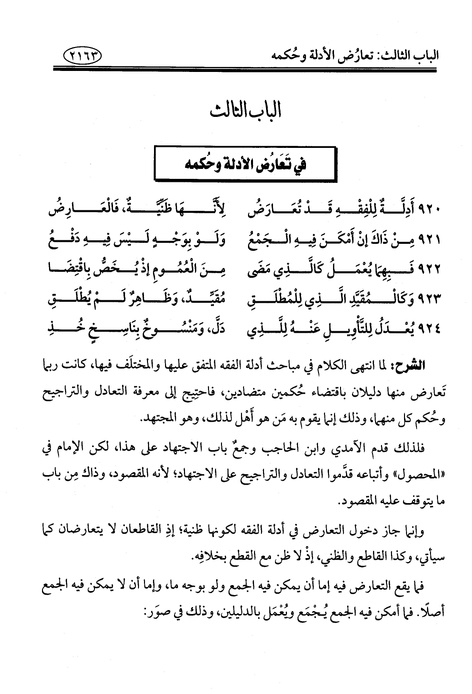 ٩٢٥ - أَدِلَّةٌ لِلْفِقْهِ قَدْ تُعَارَضُ ... لِأَنَّهَا ظَنِّيَّةٌ، فَالْعَارِضُ